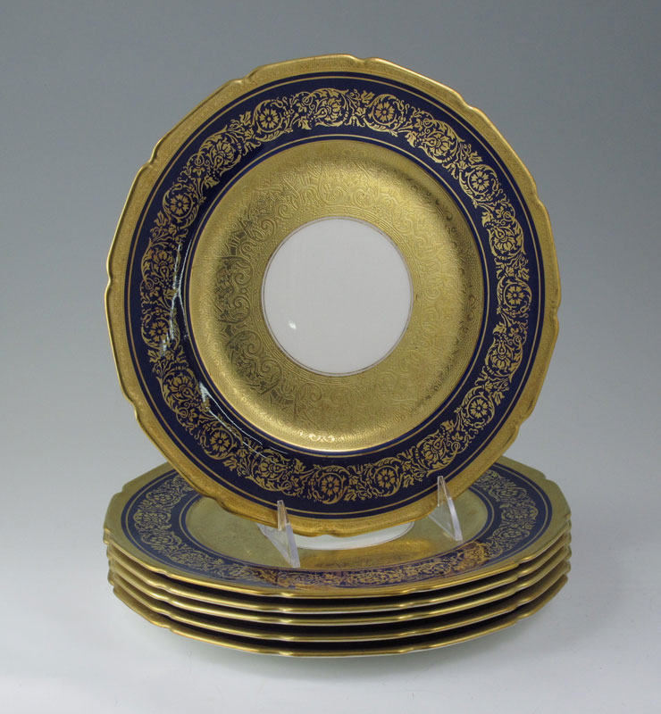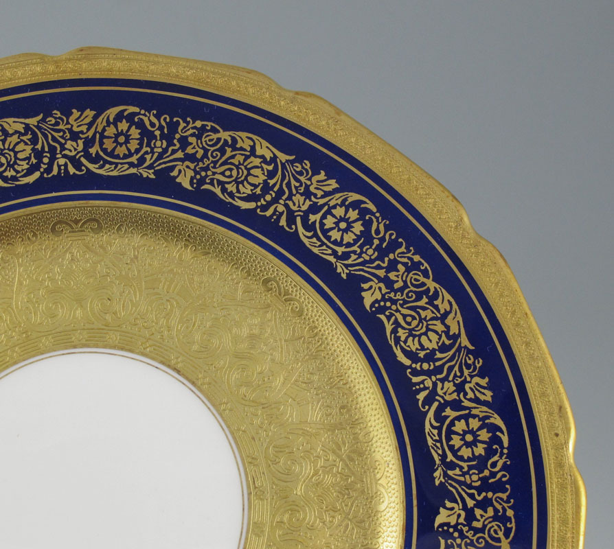 6 ROYAL DOULTON EMBOSSED GOLD AND COBALT RIM SERVICE PLATES: Fine china, retailed by Ovington's of New York and Chicago, 10 1/4'' dia.