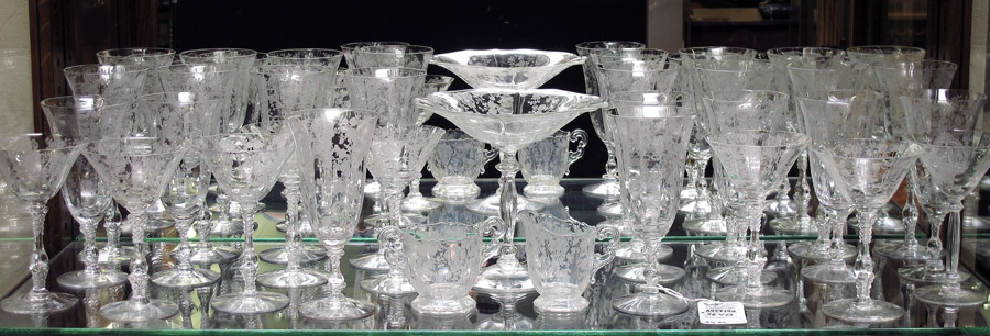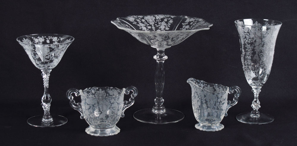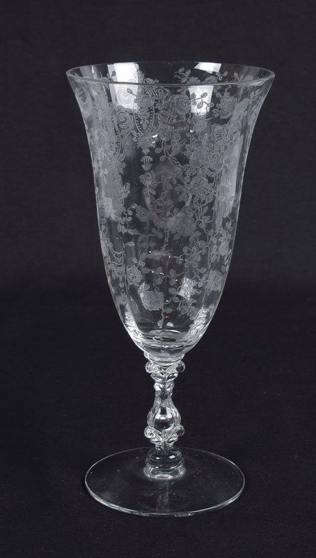 CAMBRIDGE ROSE POINT ELEGANT ETCHED GLASSWARE: Approx. 27 pieces to include 8 water goblets (8 1/4''), 8 iced tea (7 1/2''), 8 sherbert champagnes, creamer, sugar, and a compote, 7 1/2'' tall.