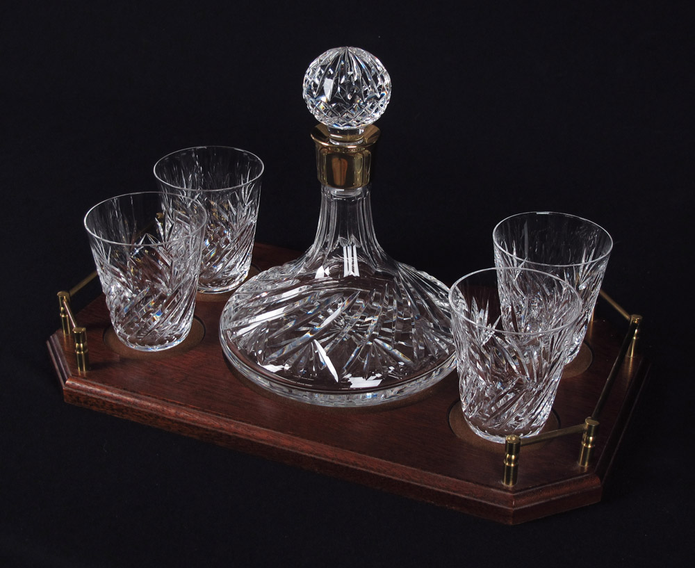 WATERFORD CRYSTAL DECANTER, TRAY AND 4 TUMBLERS: Like new with original box, to include brass mounted ships decanter (9 1/4'' h. x 7 3/4''), 4 tumblers (4'' h. x 3 1/4''), tray (2 1/4'' h. x 17'' x 10''). Sold with original box, (9 1/4'' h x 17 1/2'' x 10 1/4'').