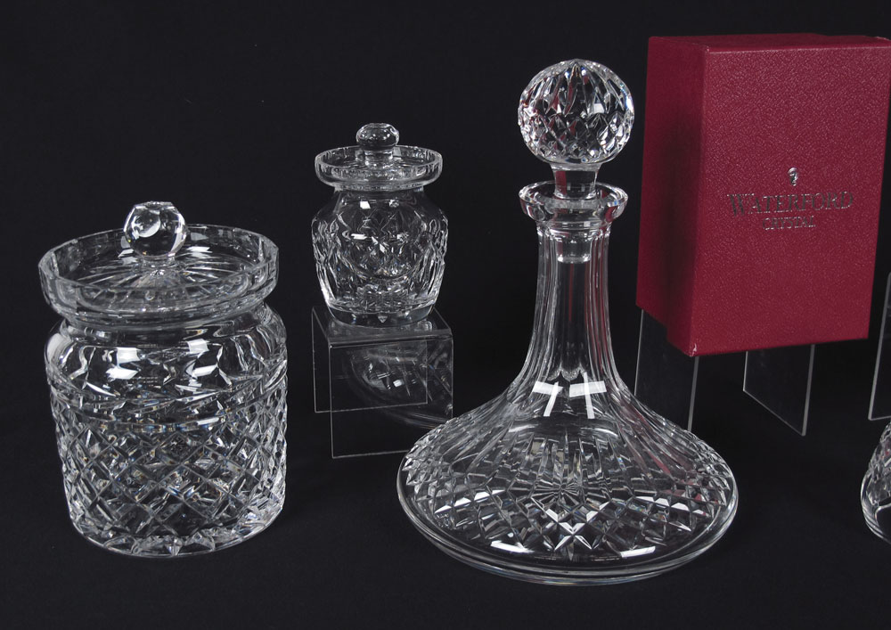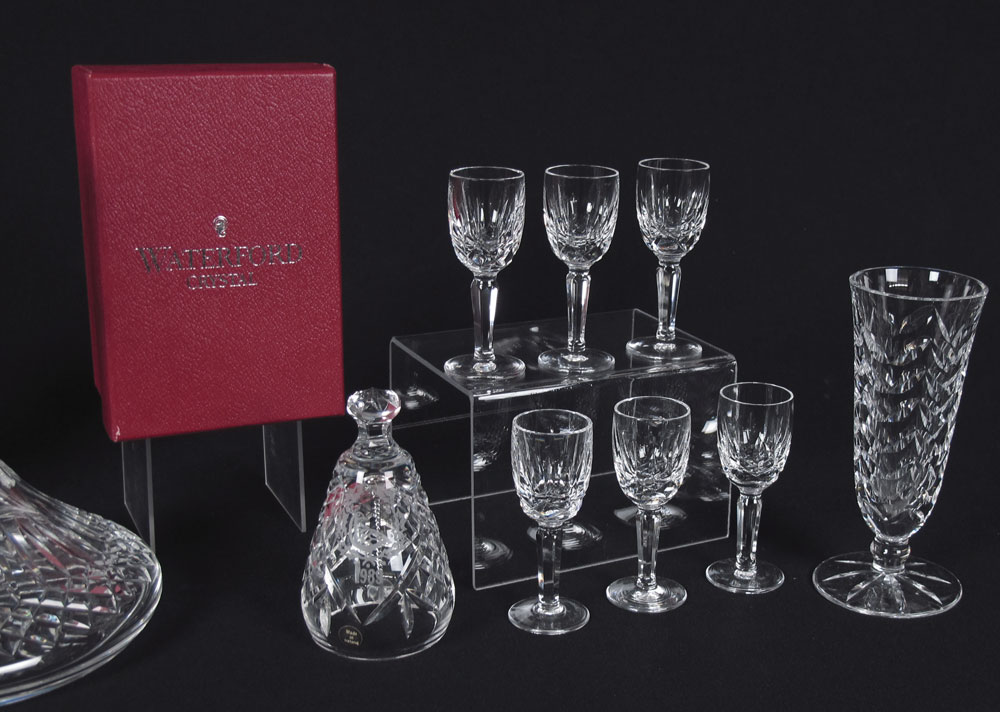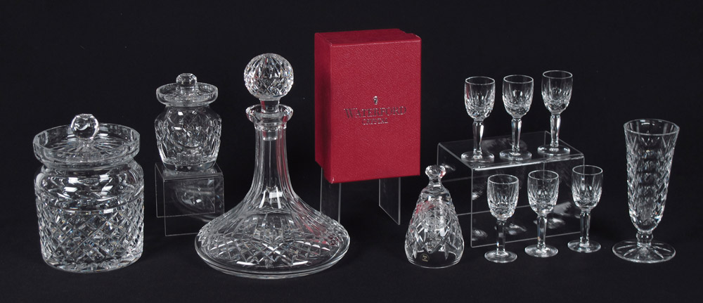 11 PIECE WATERFORD CRYSTAL COLLECTION: 11 piece to include ships decanter, honey pot, biscuit barrel, 6 cordials, bell with box, and vase in assorted patterns. Decanter measures 10'' h. x 8 1/2''.
