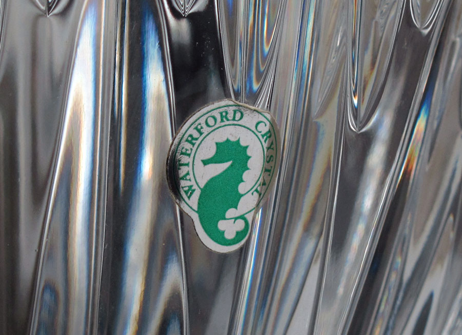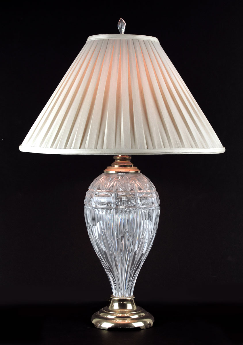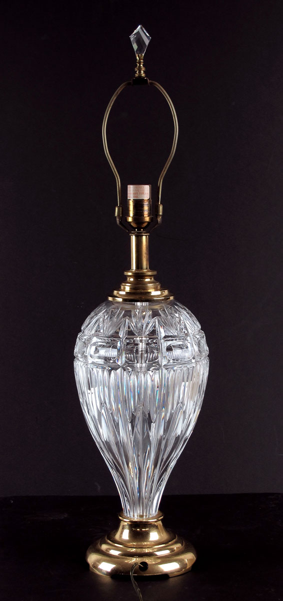 WATERFORD CRYSTAL TABLE LAMP: Brass base with Waterford crystal body, brass fixture and crystal finial. Overall 30 1/4'' h. to top of finial x 7 1/4'' dia. Original Waterford shade measures 11 1/4'' h. x 20 1/4''.