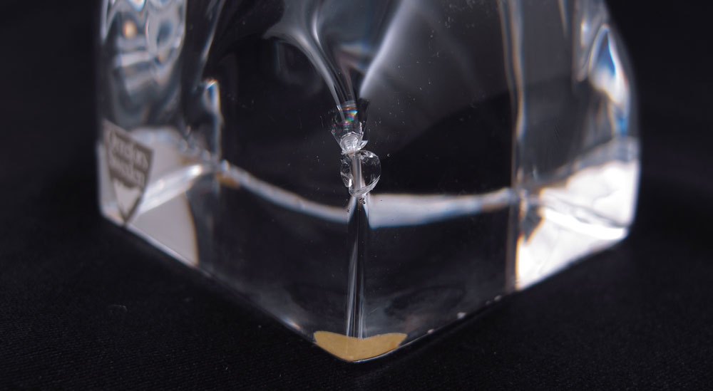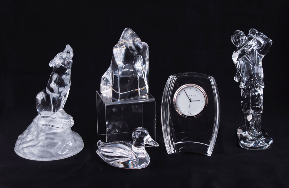 5 PIECE CRYSTAL STEUBEN, ORREFORS, WATERFORD: To include 1) Orrefors abstract gorilla paperweight, 4 1/8'' h. x 2 3/4''. 2) Waterford golfer, 6 5/8'' h. 3) Steuben desk clock, 4 3/4'' h. x 3 1/8'' x 2''. 4) Unsigned crystal duck paperweight 2 1/4'' h. x 4 3/8''. 5) Molded crystal howling wolf, 6 1/2'' h. x 4'' dia.