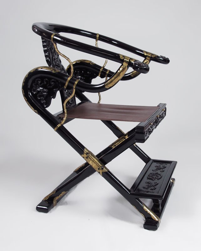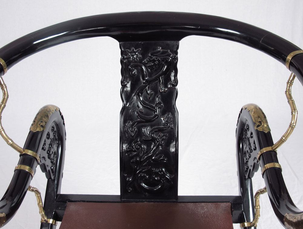 BRASS MOUNTED CHINESE BLACK LACQUER FOLDING CHAIR: U shaped top rails, foot rest, fabric seat. Approx. 34'' x 25 1/2'' x 24''.