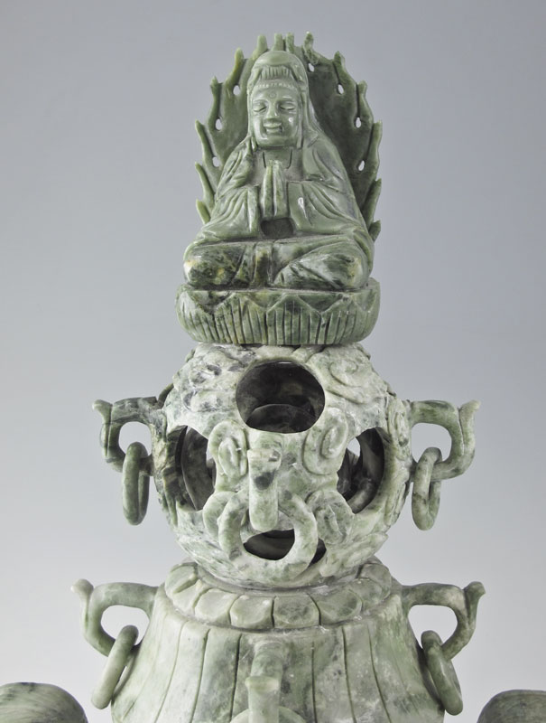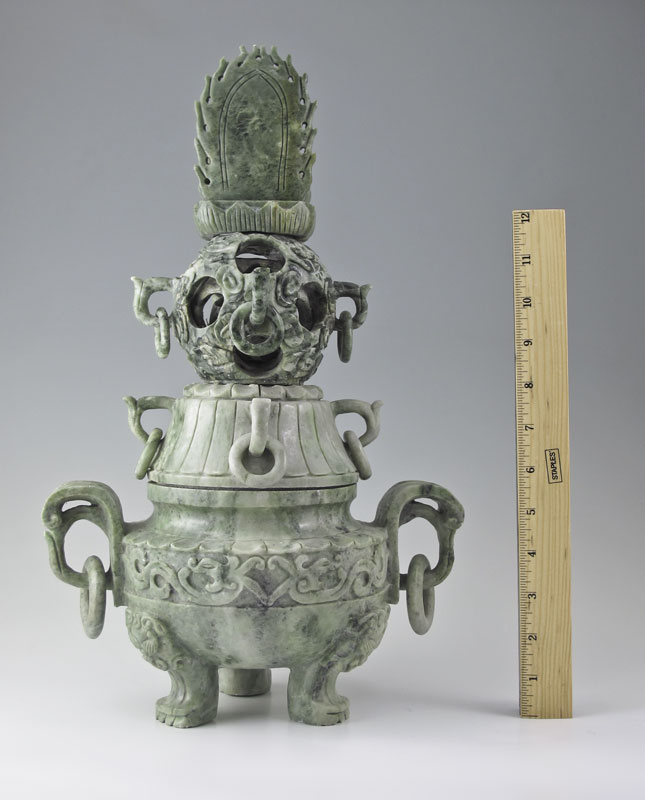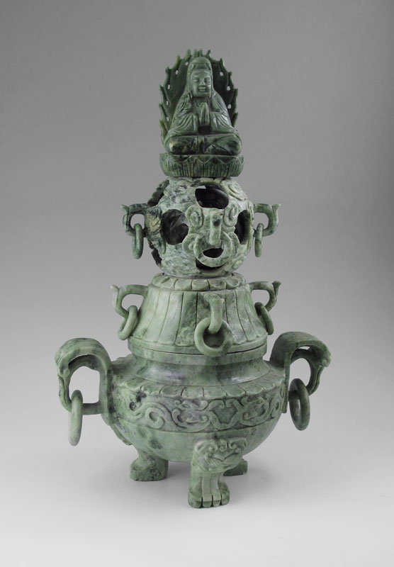 CARVED SOAPSTONE MYSTERY BALL CENSOR: Applied carved seated Hindu deity finial over carved mystery ball and ringed handled lid. Carved base with ringed floral form handles, carved body and paw feet. Overall measures 16 1/4'' h. x 10 1/2'' x 6 1/2''.