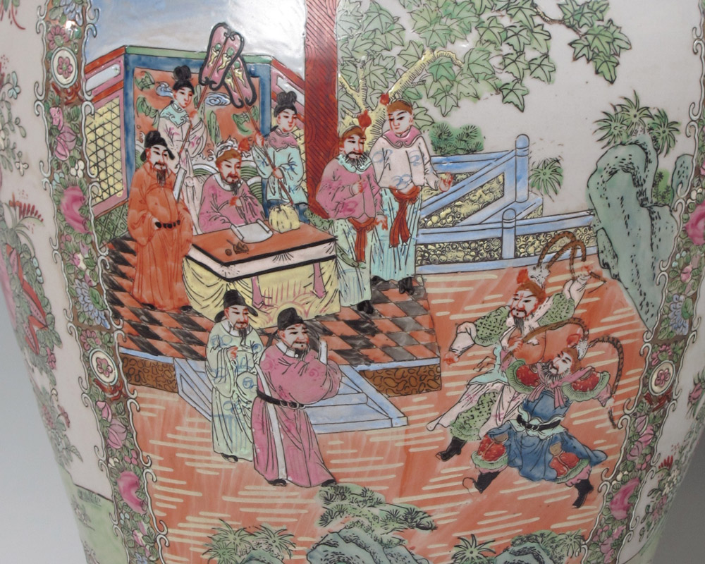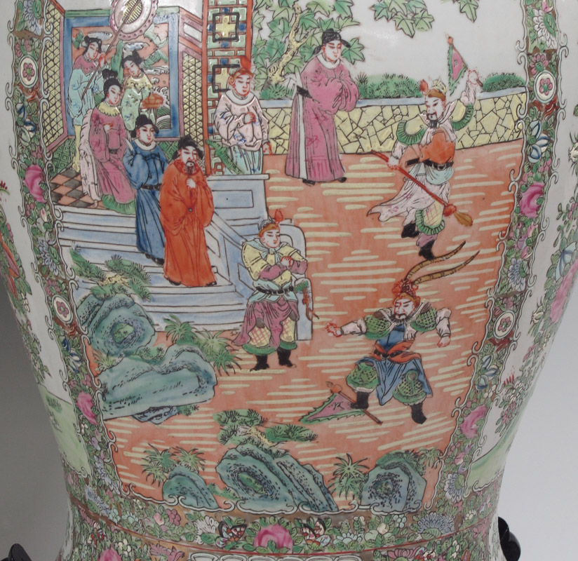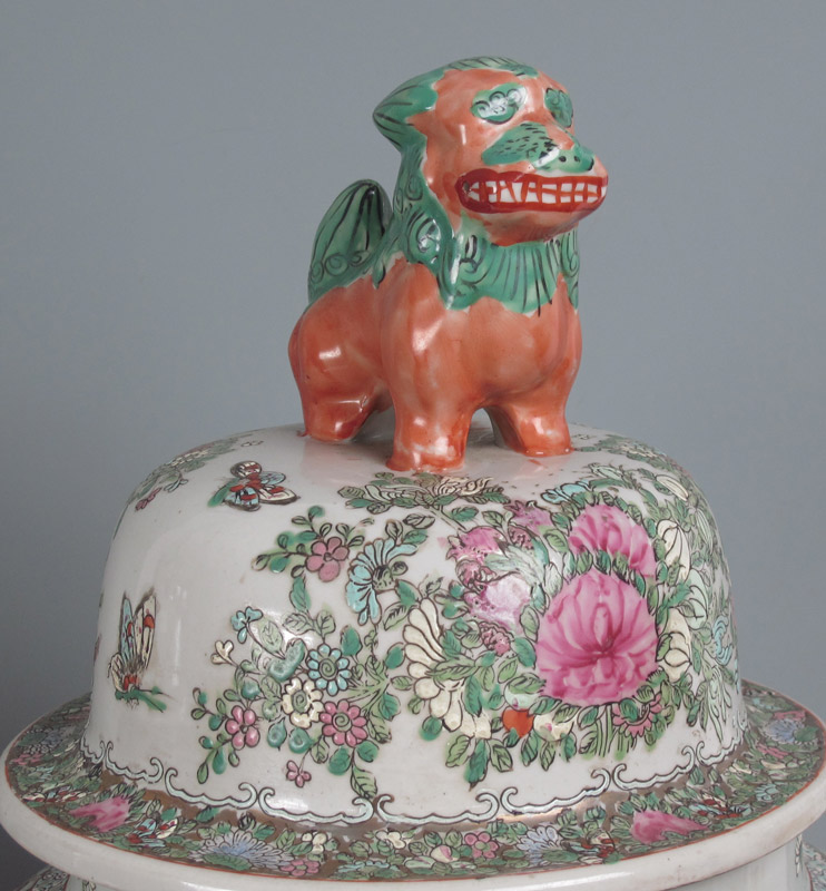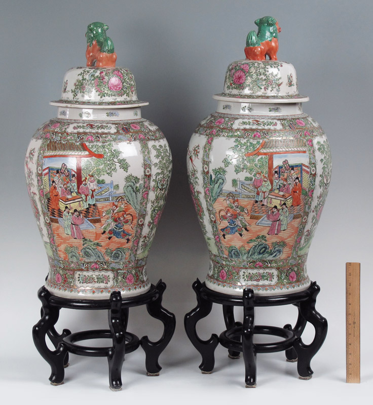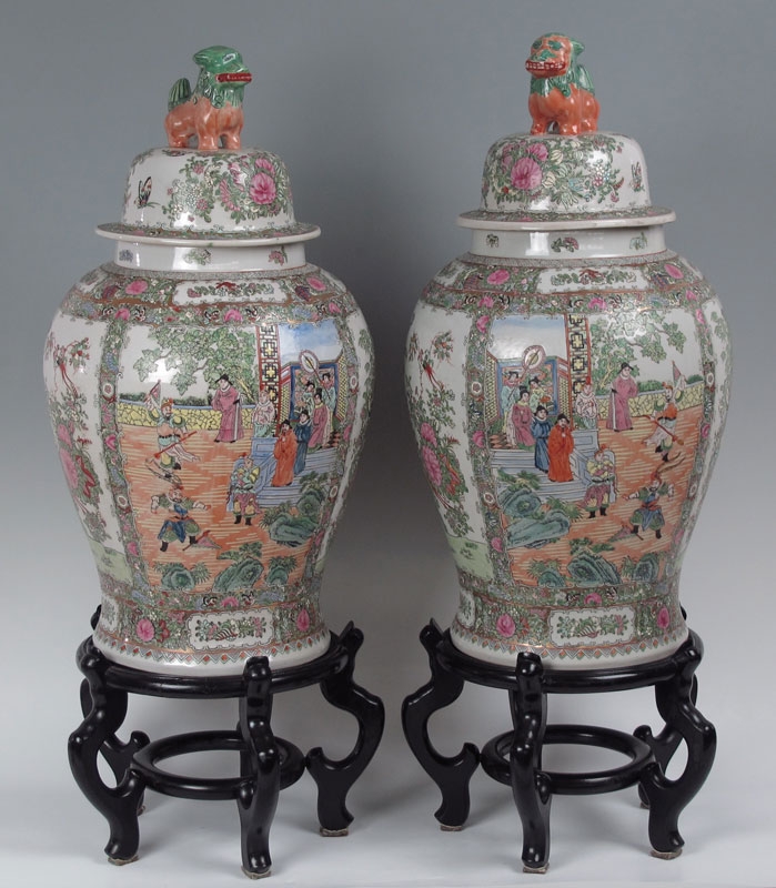 PAIR LARGE CHINESE COVERED JARS ON STANDS: Signed in characters. Surmounted by foo dog finials. Approx. 27'' tall, in the rose medallion colors. The black stands add 9'' to the height.