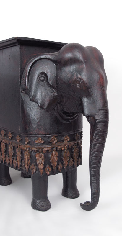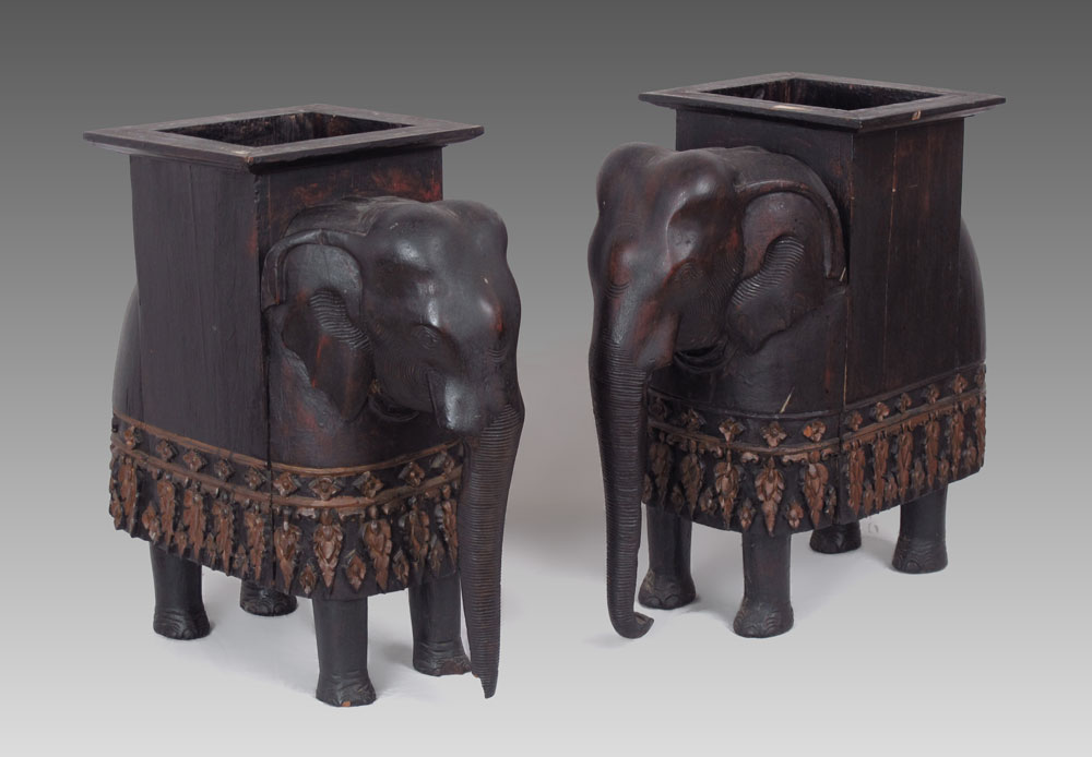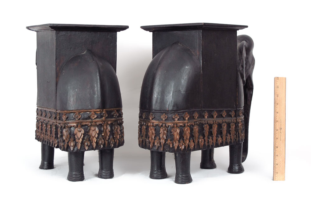 PAIR OF CARVED WOOD ELEPHANT PLANT STANDS: Carved figural elephant plant stands with carved skirts. Each measures 17 7/8'' h. x 20'' x 7 3/4''.