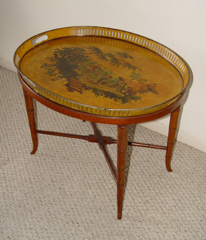 DECORATED TOLE WARE TRAY ON STAND: Scene of children playing, tray with pierced gallery, base with faux bamboo legs. 19'' h. x 25'' x 19 3/4''.