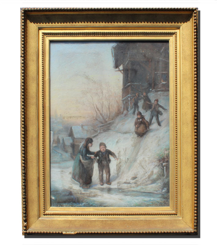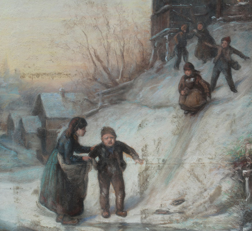 19th C. FRENCH PASTEL OF CHILDREN PLAYING IN A WINTER LANDSCAPE: Illegibly signed lower right, sight size 24 1/2'' x 18 3/4'', period frame with wear, 34'' x 27''.