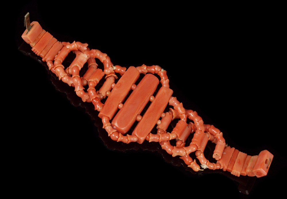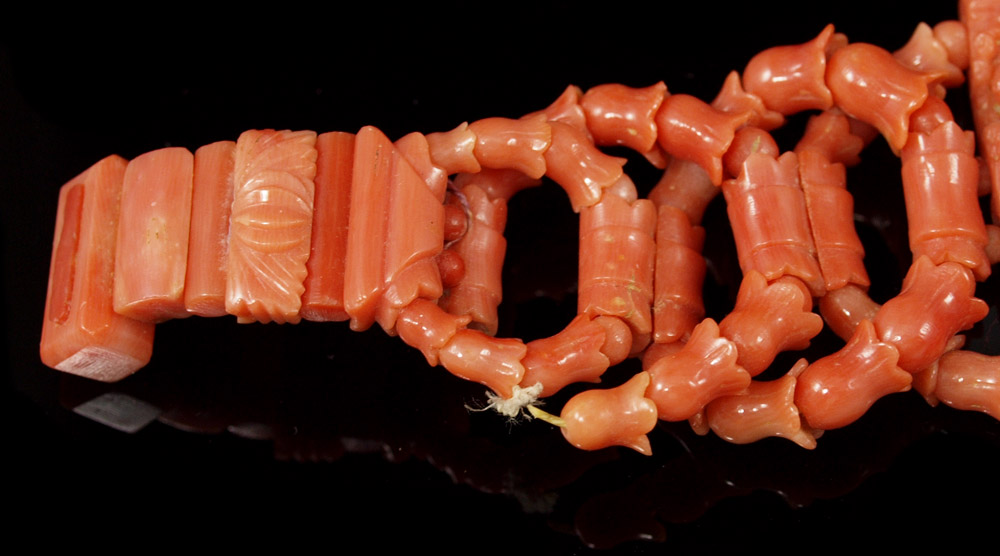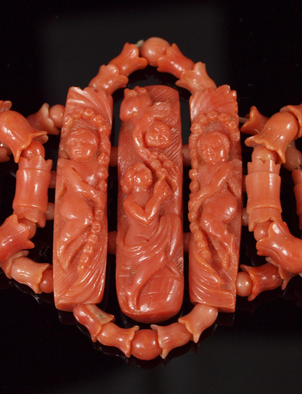 CARVED CORAL BRACELET: Floriform and round beads woven in rings to create bracelet, centered by three panels carved with cherubs and female figure, approx. 6 1/2''.