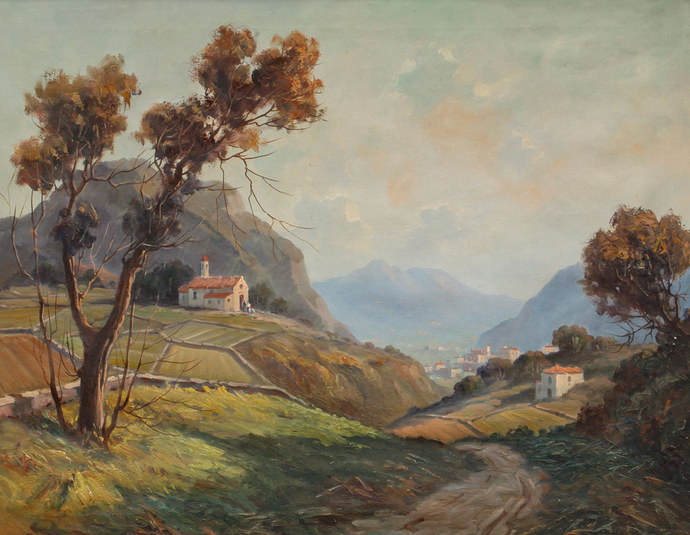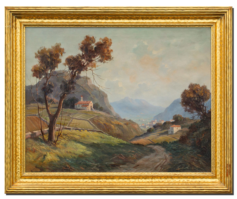 ITALIAN LANDSCAPE WITH VILLAGE IN THE VALLEY SIGNED NONETTI: OIL/Canvas, 22'' x 28'', period gilded frame 27 1/2'' x 33 1/2''.