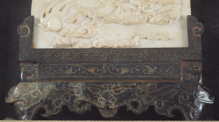 FRAMED CARVED SOAPSTONE TABLE SCREEN: Carved soapstone table screen featuring serpents, on wood base. Actual age unknown. Framed in modern shadowbox frame with oriental motif matting. Frame measures 29 1/2'' h x 25 5/8'' x 4''.