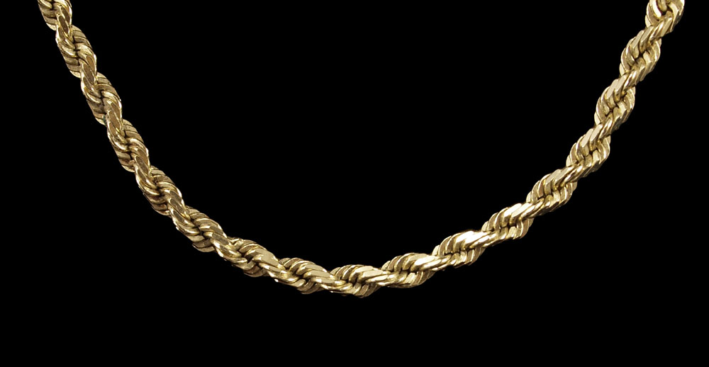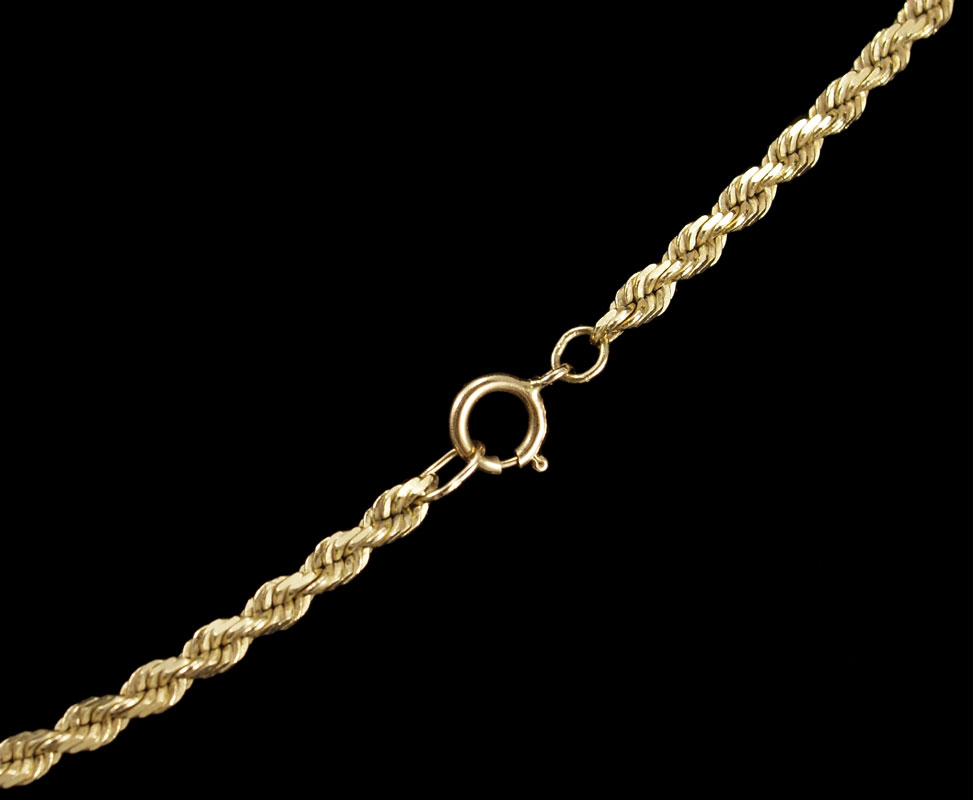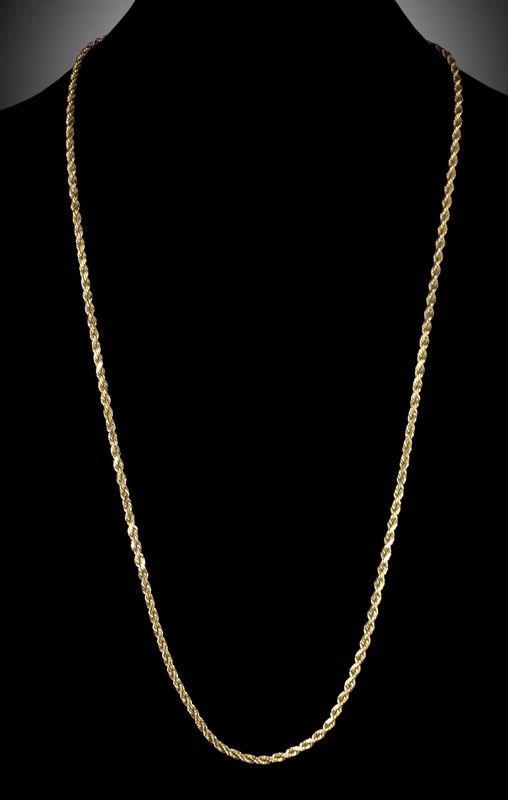 14K ROPE CHAIN NECKLACE: 14K solid yellow gold diamond cut rope chain. 2.40 mm in width. 24'' in length. Spring ring clasp. Weight: 16.8 grams