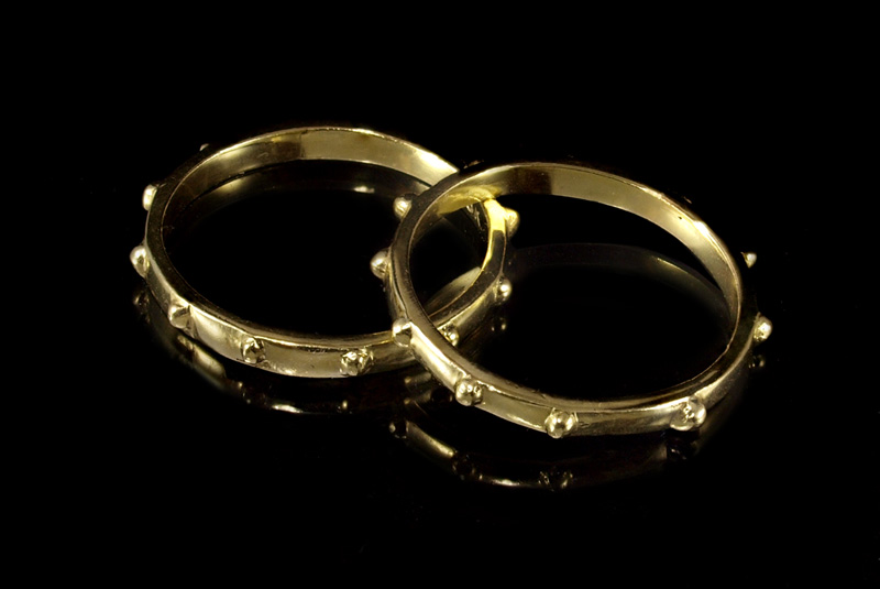 PAIR OF 18K BANDS: Pair of 18K yellow gold bands with bead decoration. Weight: 4.4 grams Size: 6.5
