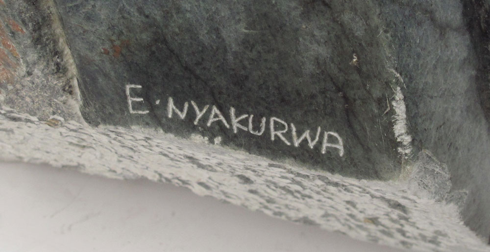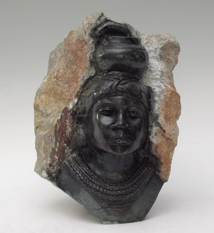 AFRICAN SHONA STONE CARVING OF ROYALTY: Carved by Ernest Nyakurwa, purposefully unfinished figure of royal woman. Signed. 17 1/2'' h. x 12 1/2'' x 11''