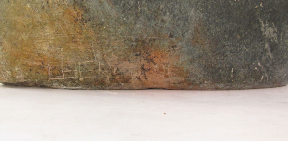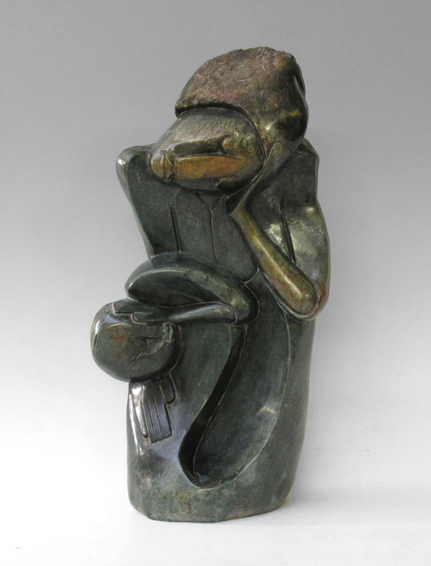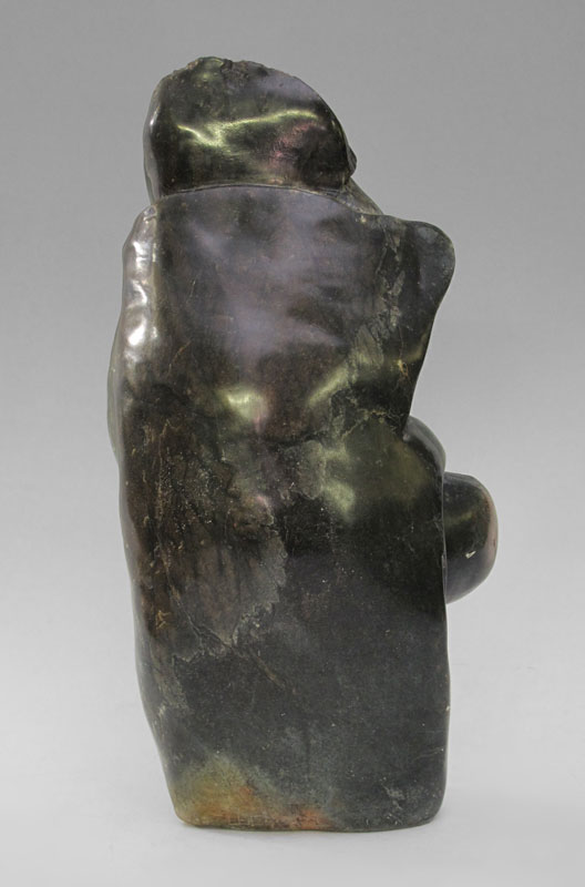AFRICAN SHONA STONE CARVING OF MOTHER AND CHILD: Illegibly signed Leer?v, carved greenish-black stone figure of a mother and child. 27 1/2'' x 13 1/2'' x 14''.