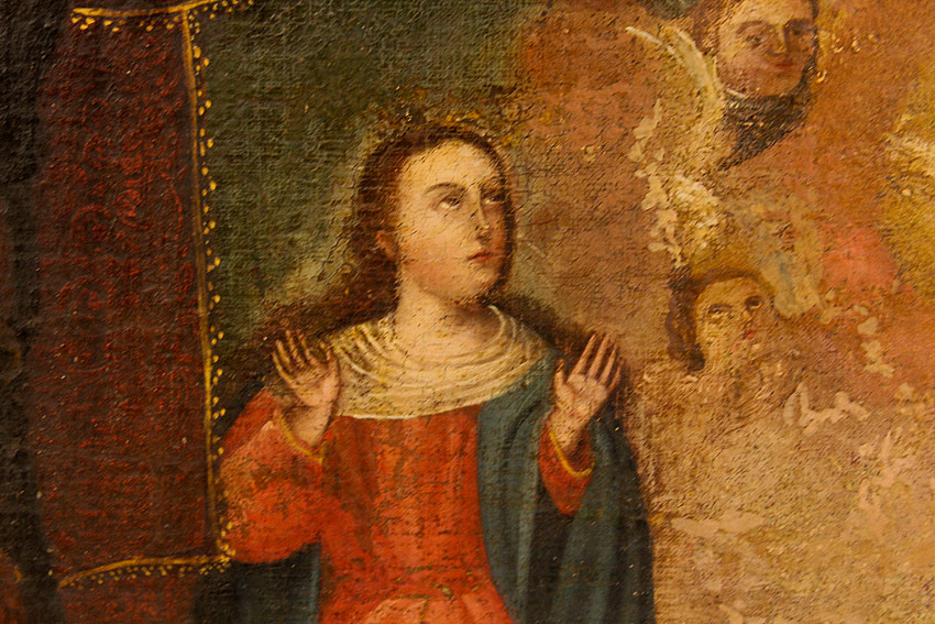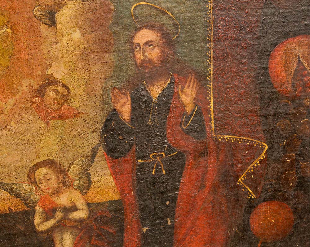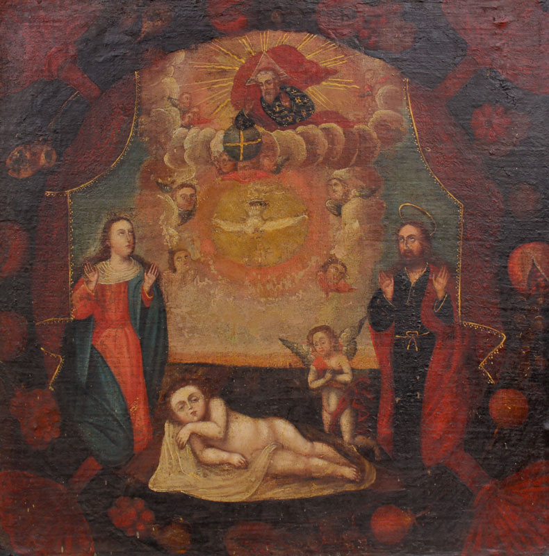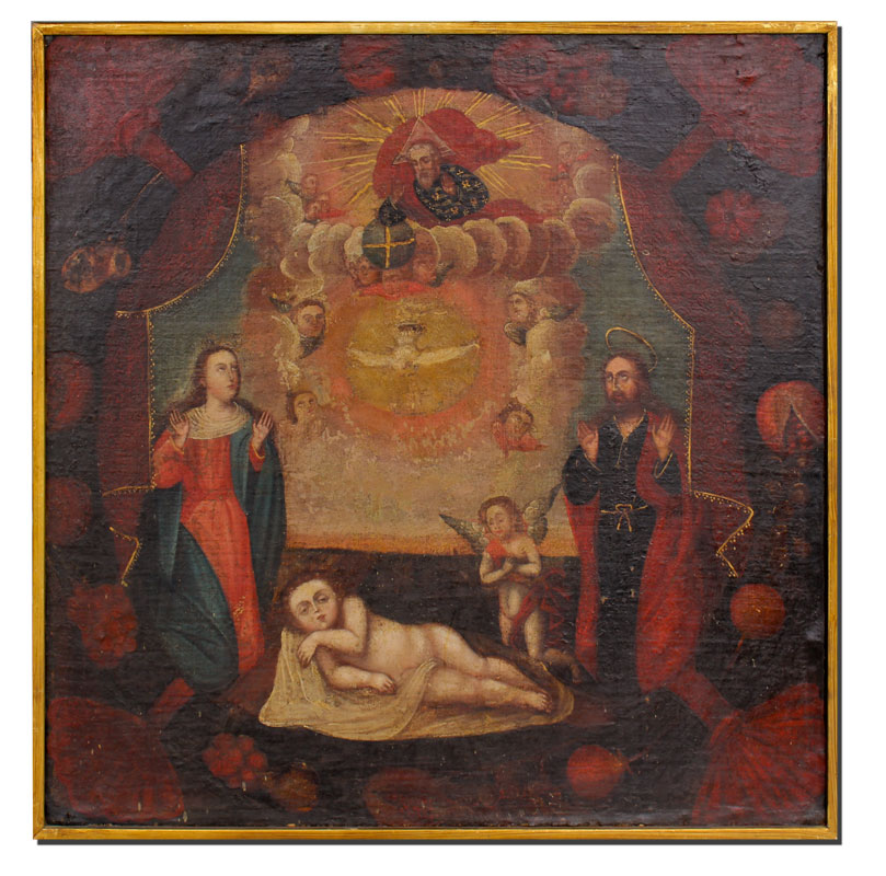 EARLY CUZCO SCHOOL RELIGIOUS PAINTING OF MADONNA BABY JESUS AND ANGELS: Oil/Canvas, 32'' x 32 1/2'', no visible signature, possibly 18th century or earlier, encased in a later gilded wood frame, 33'' x 33 1/2''.
