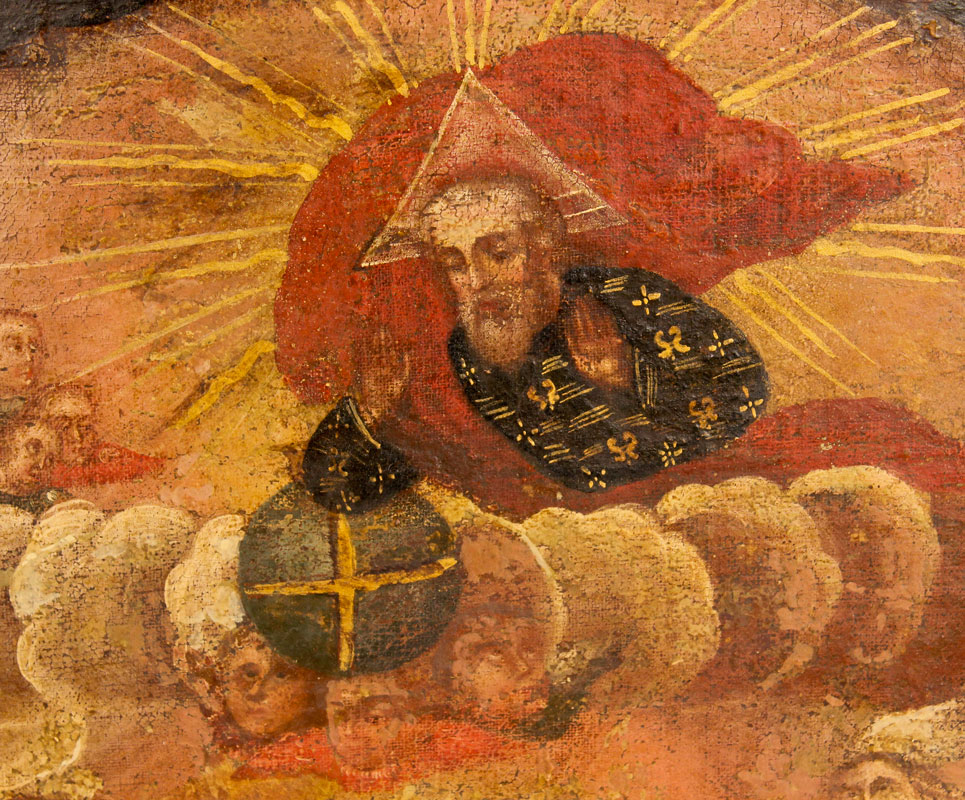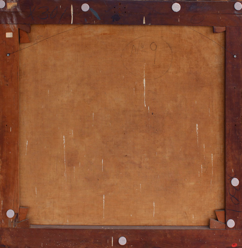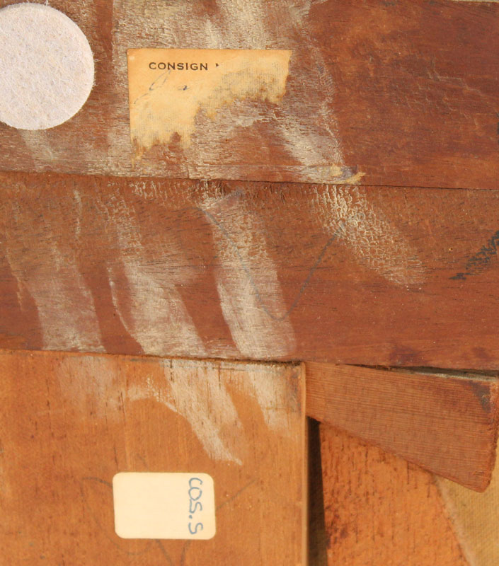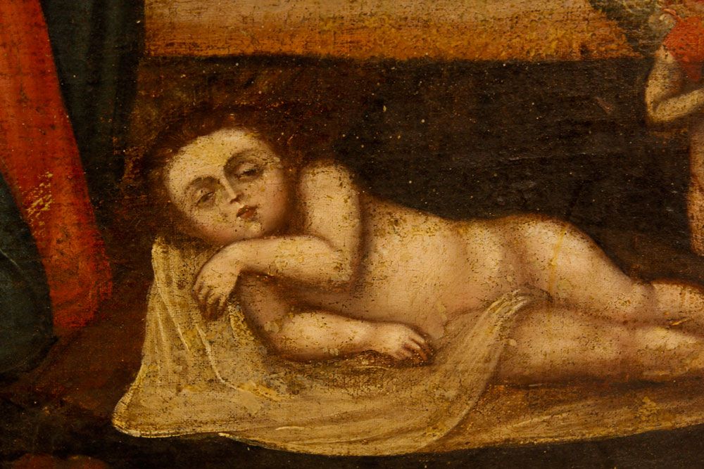 CONDITION: Relined, with several areas of paint fleck and scattered inpaint. Possible patch in upper right corner. Needs work but well worth it.
