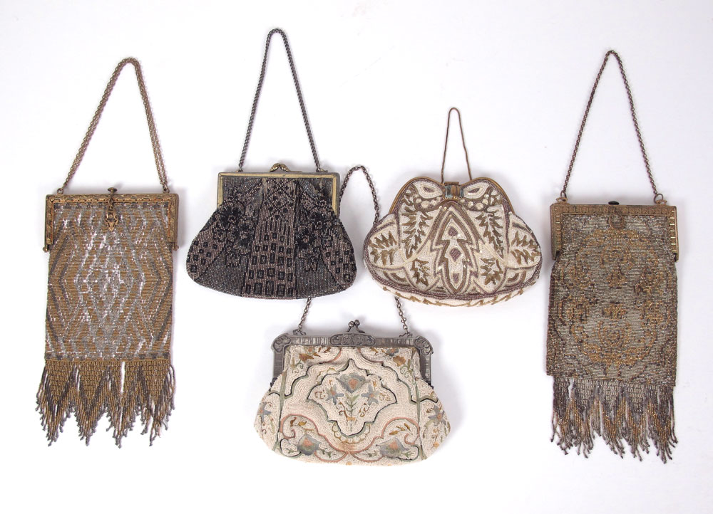 GROUP OF 5 VINTAGE BEADED PURSES: 3 are Made in France. Metallic shades and white beads. The largest measures 9'' x 5'', including fringe.