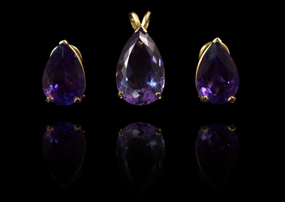 15 CTW AMETHYST PENDANT & EARRING SET: 14K yellow gold pendant and earrings contain 3 pear shaped amethysts. Weight: 15.00 Ct. Approx. The amethyst are prong set. Post and hinged clip closures. Fixed bail pendant. Mounting Weight: 6.4 grams approx.