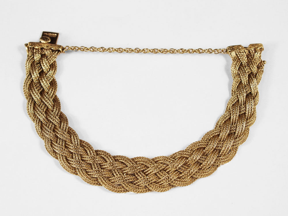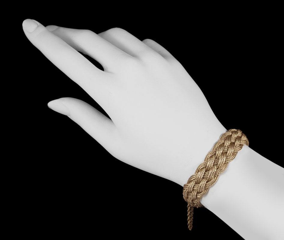 14K GOLD WEAVE BRACELET: 14K yellow gold bracelet. Braided mesh. .50'' in width. 7.5'' in length. Locking closure with figure eight safety clasp and safety chain. Weight: 24.5 grams