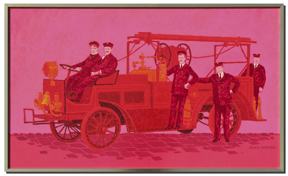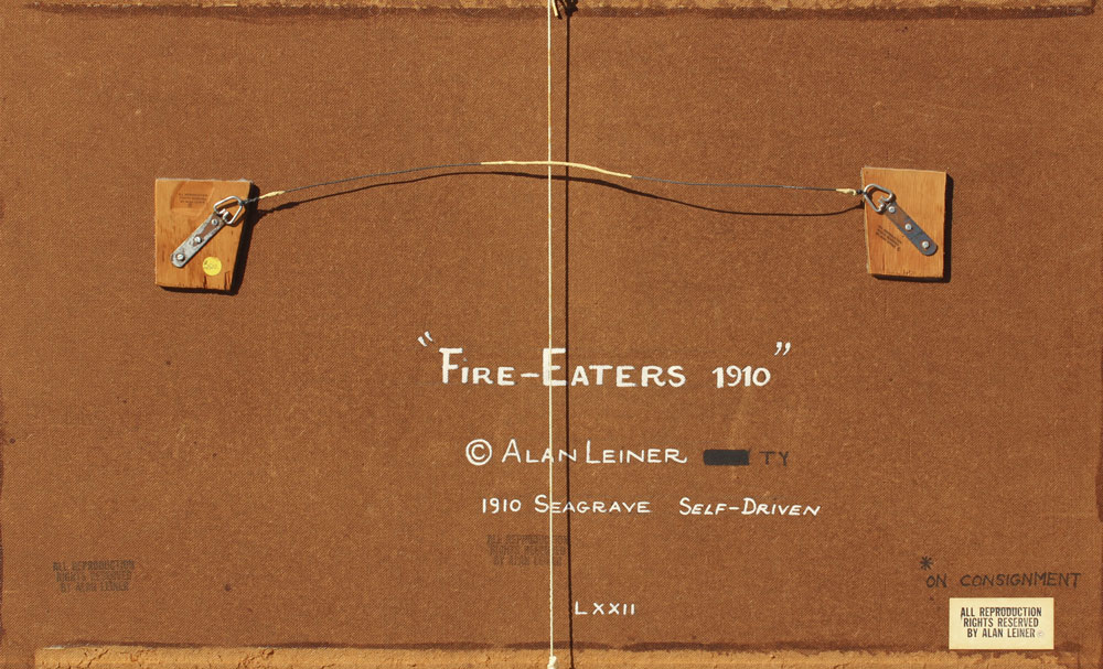 LEINER, Al, (American, 1938-2001): ''Fire-Eaters 1910, 1910 Seagrave Self Driven'', ACRYLIC/ Masonite, depicts a Fire Engine of the day, 29'' x 48'', signed lower right, signed and titled verso, encased in thin edge metal frame, 29'' x 48''.
