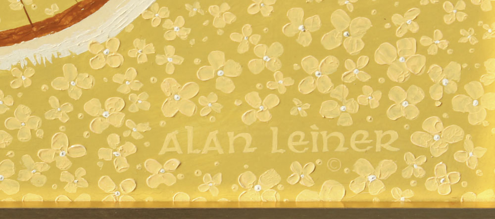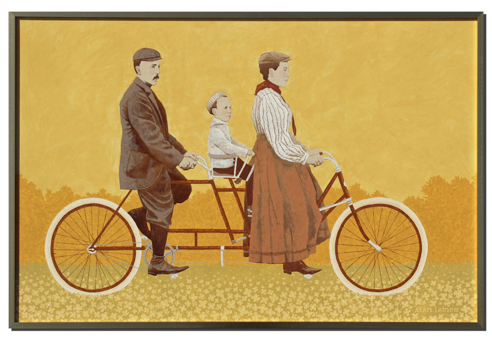 LEINER, Al, (American, 1938-2001): ''The Schwinn Family'', Ignatz Schwinn, son Frank and Wife, 1898'', ACRYLIC/ Masonite, 32'' x 48'', signed lower right, signed and titled verso. The authenticity of costume will delight costume buffs. Encased in thin edge metal frame, 32'' x 48''.