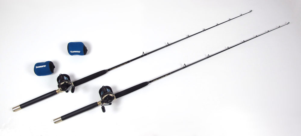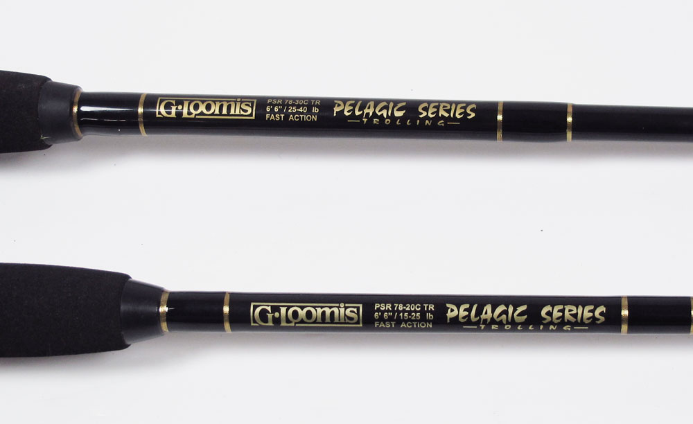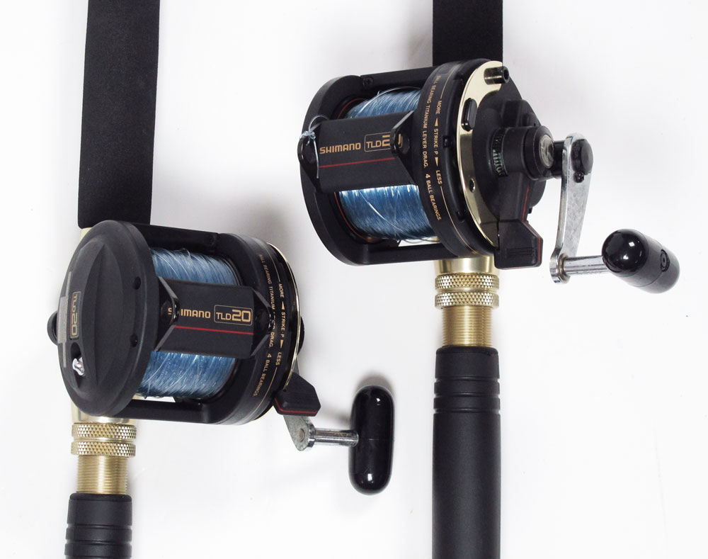 PAIR SHIMANO TLD-20 REELS & G. LOOMIS FISHING RODS: Pair of identical rods and reel combinations, each to include 1) Shimano TLD-20 graphite body reels. 2) G. Loomis Pelagic Series Trolling rods, 6' 6''. 25-40 lbs lines, fast action. Sold with Shimano neoprene reel covers.