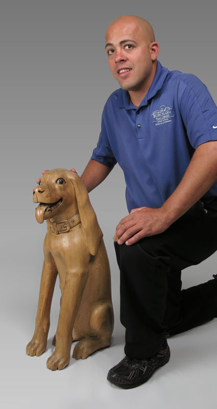 LIFE SIZE CARVED WOODEN LABRADOR RETRIEVER DOG: Painted accents to eyes, nose and collar. 27 1/2'' h. x 9'' x 13''.