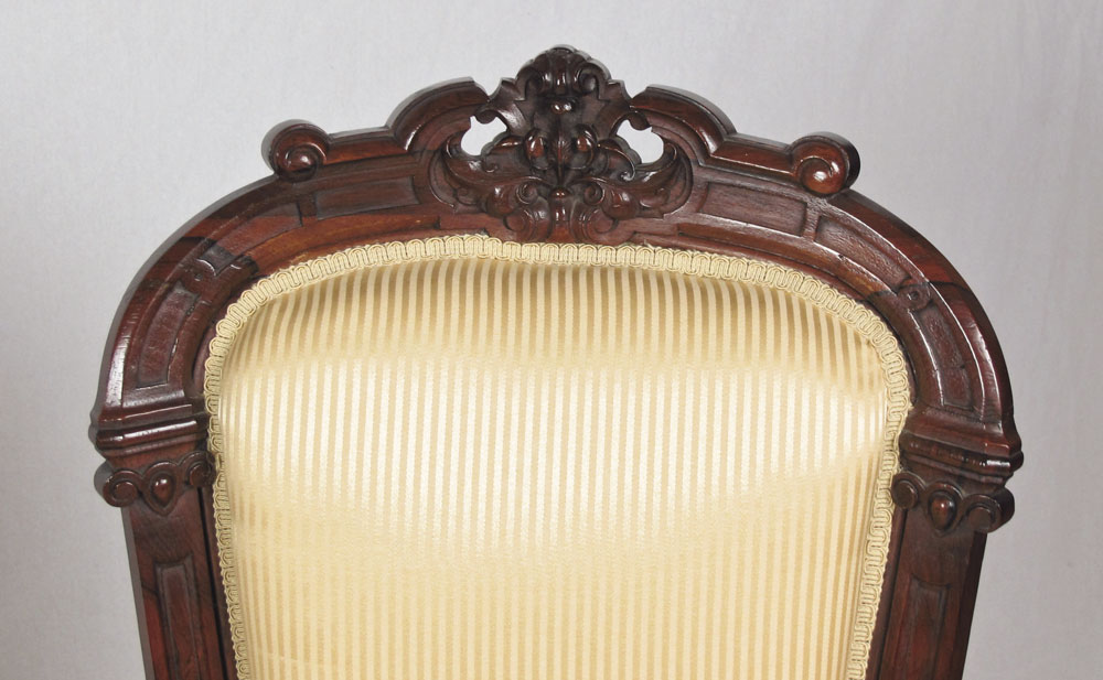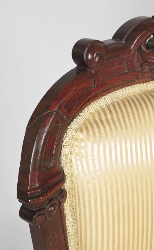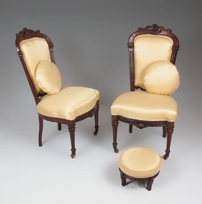 FRENCH VICTORIAN CARVED SIDE CHAIRS AND STOOL: Pair of side chairs with carved top rail, sides, skirt and front legs. Castors on front legs. Striped gold upholstery. 39'' h. x 19 1/2'' x 23''. Sold with matching upholstered stool, 7 1/4'' h. x 11 1/2''.
