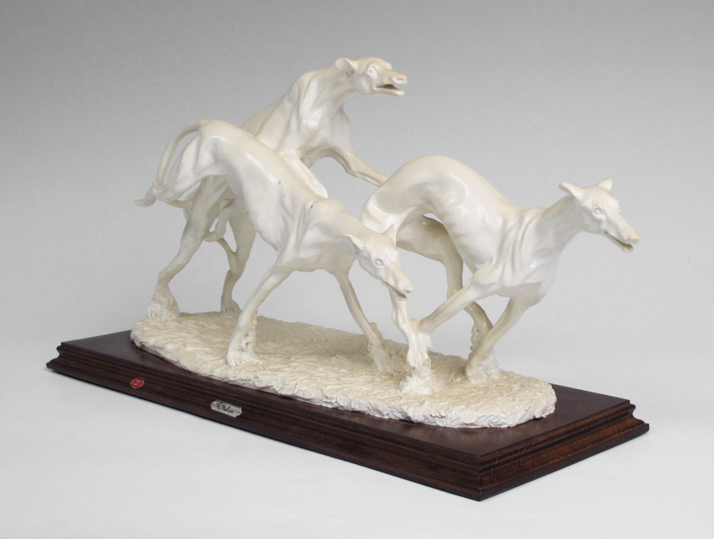 AURO BELCARI CAPODIMONTE SCULPTURE OF GREYHOUNDS: Composite composition, figure of 3 greyhounds racings, affixed to wood base. Original Capodimonte tag. 9 7/8'' h. x 17 3/4'' h. x 6 1/2''.