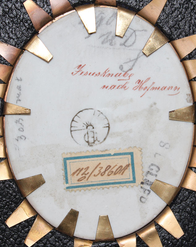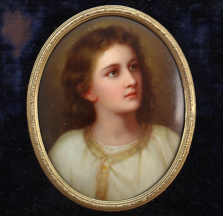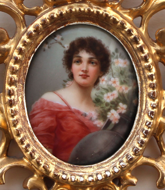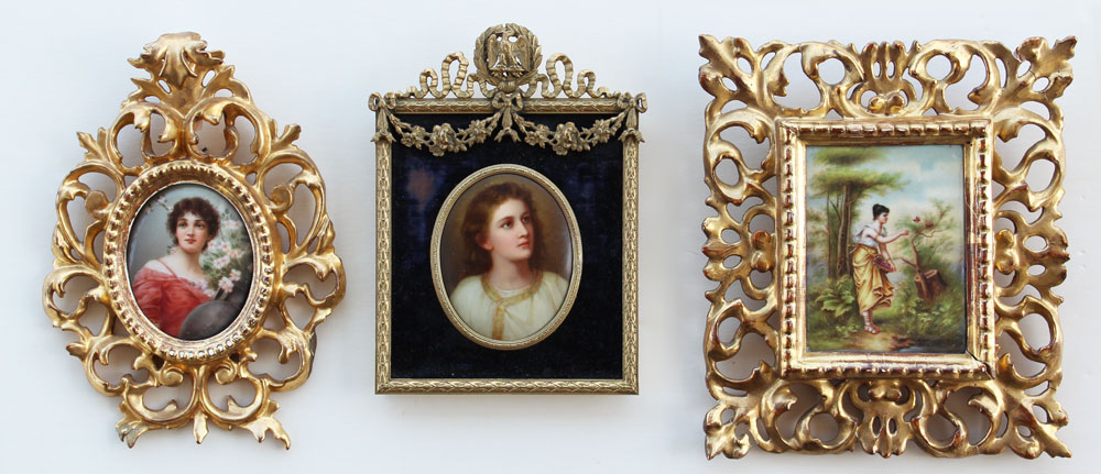 THREE PIECE MINIATURE PAINTING ON PORCELAIN LOT TO INCLUDE: 1) Baby Jesus, sight size 3 1/4'' x 2 1/2'', encased in a gilded metal frame, 7 1/2'' x 5''. This has floral festoons and ribbon cartouche with German eagle crest. Label affixed verso in German reads 'Baby Jesus'. 2) Young Beauty with Flower Blossoms, sight size 3'' x 2 3/8'', illegibly marked verso, encased in pierce carved and gilded frame with minor wear, 7 1/2'' x 6''. 3) Young Maiden in a Forest Setting with Birds, sight size 4'' x 3'', encased in period pierce carved gilded frame with wear and missing gilt, 8 1/4'' x 7 1/4''.