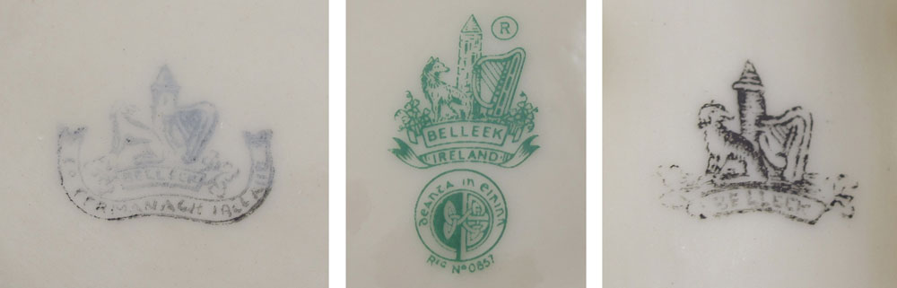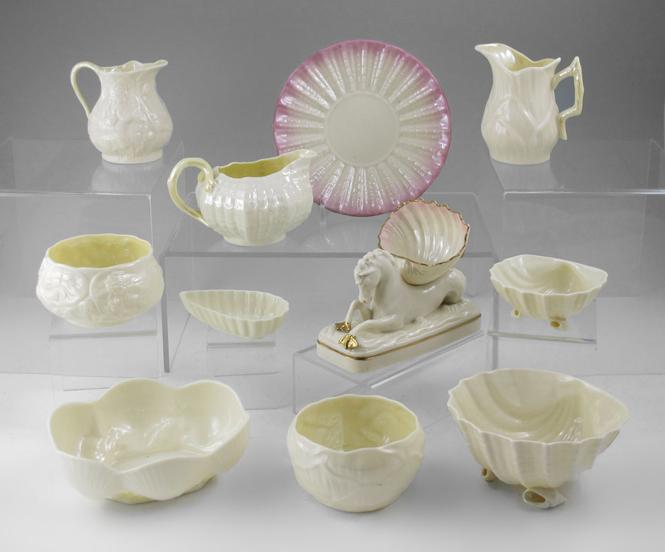 11 PIECE COLLECTION OF BELLEEK PORCELAIN: 11 pieces of assorted pattern and color marks to include 3 creamers, 4 bowls, footed bowl, plate, tray and mythological sea horse with shell on back (black mark). Horse measures 4'' h. x 5 1/4'' x 3 1/4''.