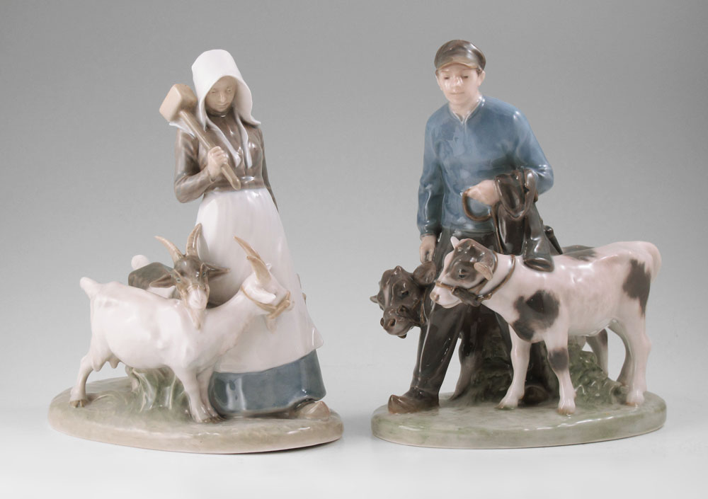 2 ROYAL COPENHAGEN PORCELAIN FIGURES: 1) Man with Calves #1858, 9 1/2''h. 2) Woman with Goats #694, 9 1/4''h.