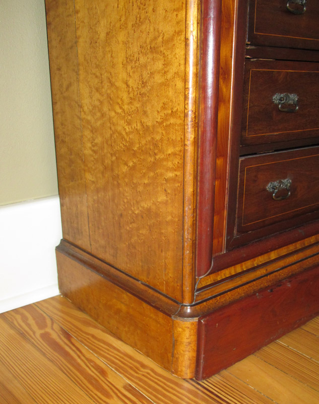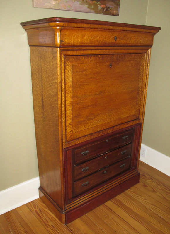 19TH CENTURY SECRETARY ABATTANT: Mixed wood with burl veneer top section and sides. Single drawer over abattant door, opens to reveal string inlay drawers of various sizes. Over 3 drawers with string inlay. Addition piece of wood applied to front of base. 54 5/8'' h. x 38'' x 16 1/2''.