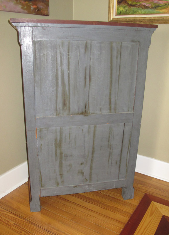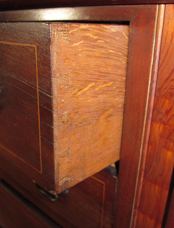 CONDITION: Note chip to veneer on top drawer, age splits to sides, one drawer pull split in half, evidence of prior wood worm damage on back.