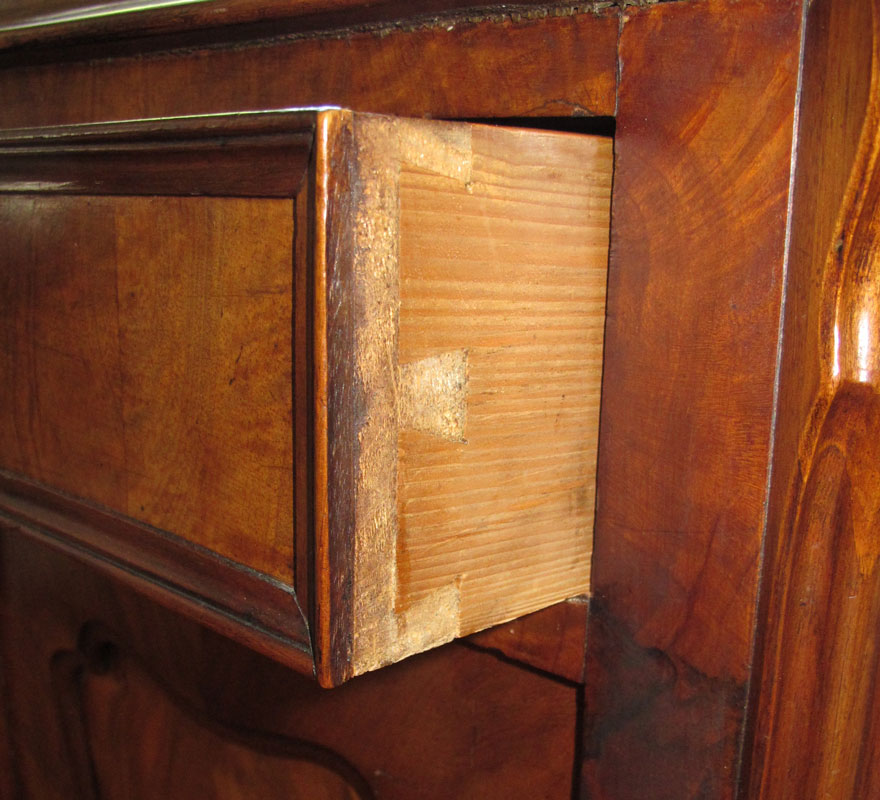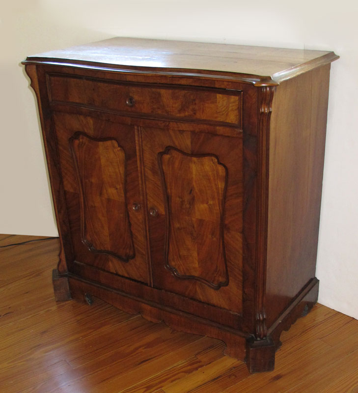 FRENCH WALNUT COMMODE: Serpentine overhanging top, full length drawer over doors. Interior shelf. Matchbook veneer top and front panels. Nice warm patina. Approx. 35''h. x 35 1/2'' x 19'' deep. Slight wear to the top.