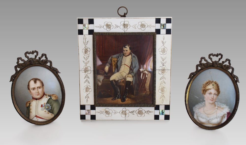 2 NAPOLEON MINIATURES & 1 of JOSEPHINE: Napoleon Seated is an enhanced print, encased in an Ivory, mother of pearl and ebony frame with gilt metal, sight size is 3 3/4'' x 3'', frame is 5 1/2'' x 5''; Napoleon and Josephine portraits are on porcelain, 3 1/2'' x 2 1/2'', they are both signed Silvestre, and in matching gilt metal frames, 4'' x 3''.