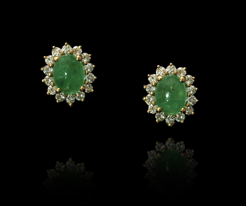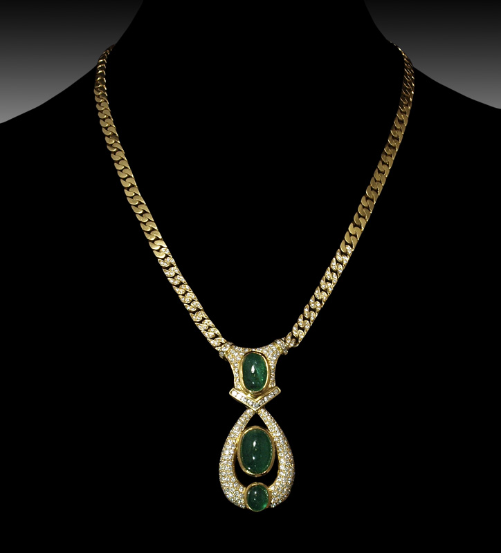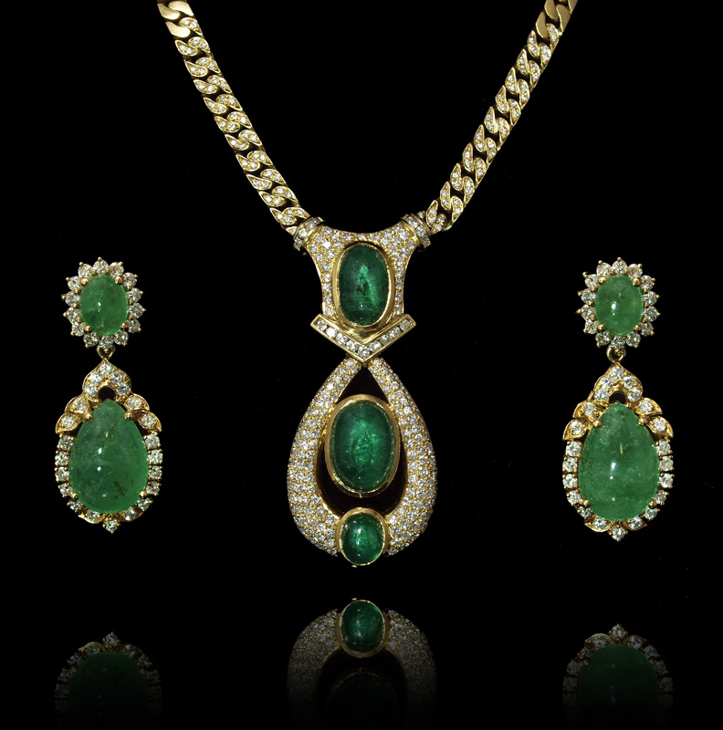 18K DIAMOND AND EMERALD NECKLACE AND EARRINGS SUITE: 1) Convertible EARRINGS: 18K yellow gold with 2 oval shaped and 2 pear shaped cabochon cut emeralds, totaling approx. 25.82 Ct., SI in clarity, G hue, 4 tone, and 3 saturation. 72 round brilliant diamonds, total approx. 3 Ct., SI in clarity and G-H-I in color. Post hinged closures. Convertible dangle pendants. Length 1 5/8'', 48.1 grams. NECKLACE: 3 Oval shaped cabochon emeralds total 12.58 Ct., SI clarity, G hue, 4-5 tone, and 4 saturation. 256 round brilliant cut diamonds total 3.20 Ct., VS clarity and G-H in color. The pendant is approx. 2 1/4''l. Weight 48.1 grams. Suite TOTAL diamond weight 6.20 Ct. TOTAL emerald weight 38.90 Ct. Sold with two current Florida Diamond Appraisers GIA graduate combined appraisals for $33,150.