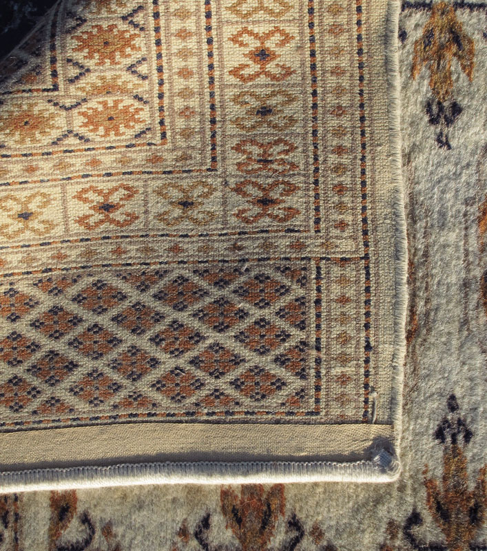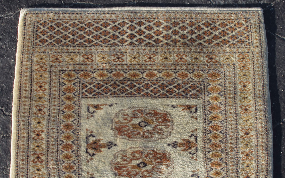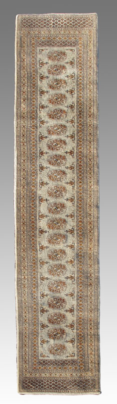 PAKISTANI BOKHARA HAND KNOTTED WOOL RUG, 2' 7'' x 10' 6'': This runners field has an ivory ground with a row of Guls running down the center. The rest of the field design consists of half guls in a different pattern that go down the sides. The field is framed by multiple borders that are darker than the field but use the same colors of deep gold, dark blue, ivory, and two shades of beige. This somewhat neutral color rug would fit in with many decors and color schemes. Condition is good.