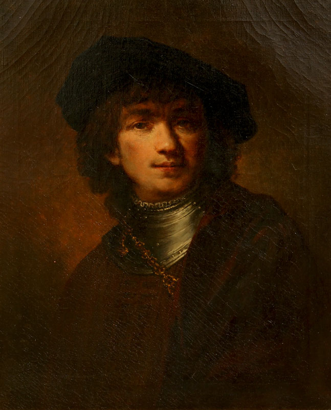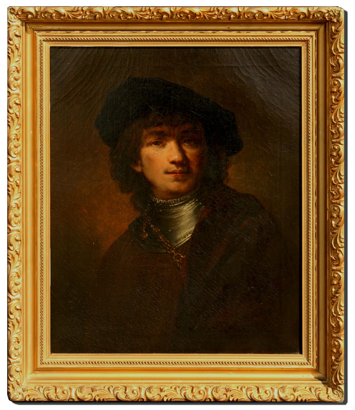 POSSIBLY 19TH CENTURY OIL ON CANVAS PORTRAIT AFTER REMBRANDT: No visible signature, 24'' x 20'', Gilded gesso frame with wear, 29 1/2'' x 25 1/4''.