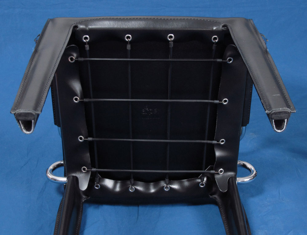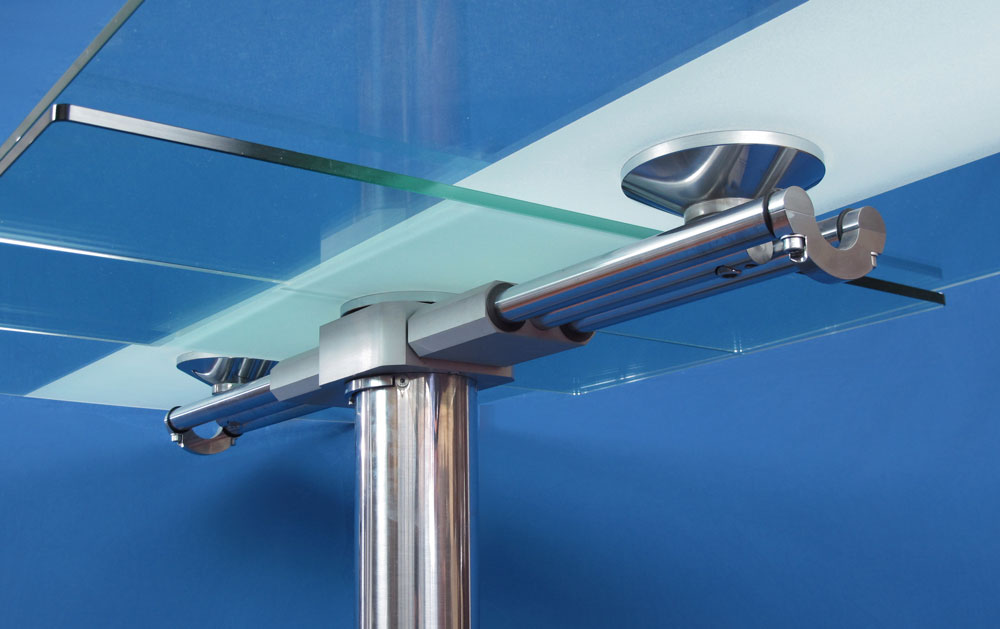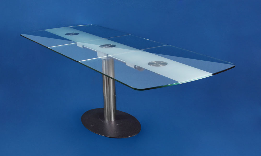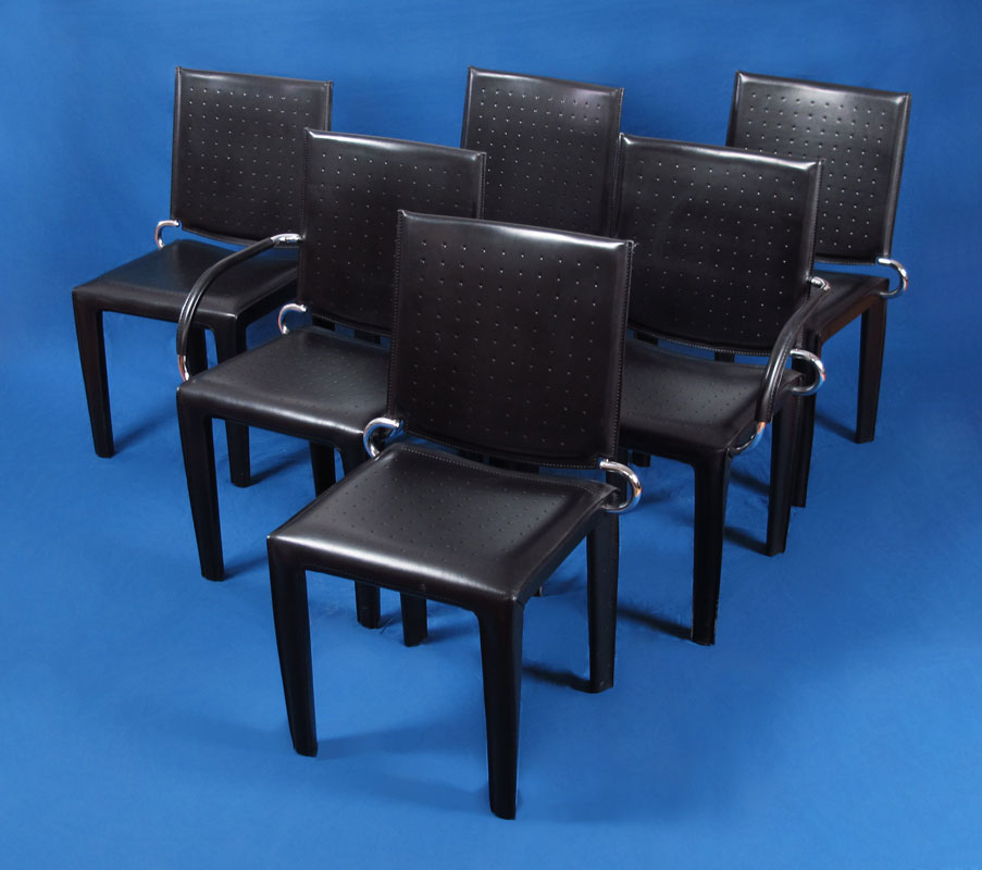 ITALIAN GLASS TOP EXTENSION DINING TABLE AND 6 ARPER LEATHER CHAIRS: Brushed aluminum and chrome pedestal base dining table with glass top. There is a strip of frosted glass down the length that keeps hidden the extension mechanism. Table measures approx. 30'' h. x 66'' x 35 1/2'' extends to 90'' with center leaf. Sold together with 2 arm and 4 side steel frame leather chairs by Arper.