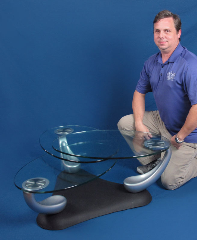 NAOS TREFLE ITALIAN MODERNE COFFEE TABLE: Articulated 3 level shelves. Marked with Naos tag. Open measures 16 1/2'' h. x 60'' dia., closed 39'' dia. Retails for over $3000 new.