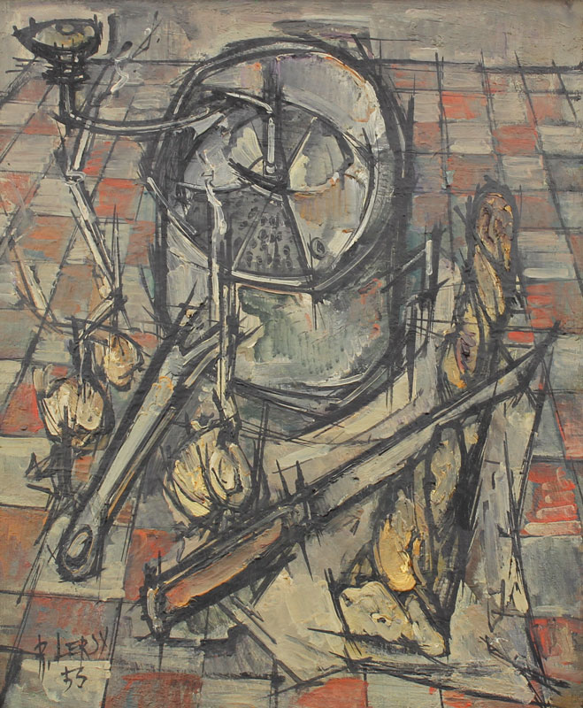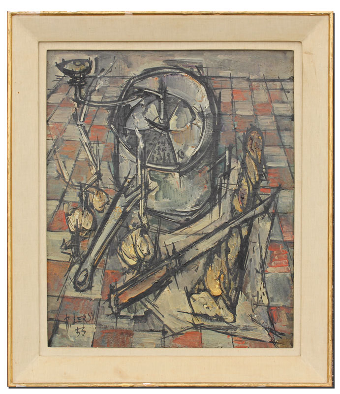 LERSY, Roger, (French, 1924-2004): Modernist still life, OIL/Canvas 25 1/2'' x 21 1/4'', signed lower left, dated '53, encased in worn painted and gilded period frame 31'' x 27''.