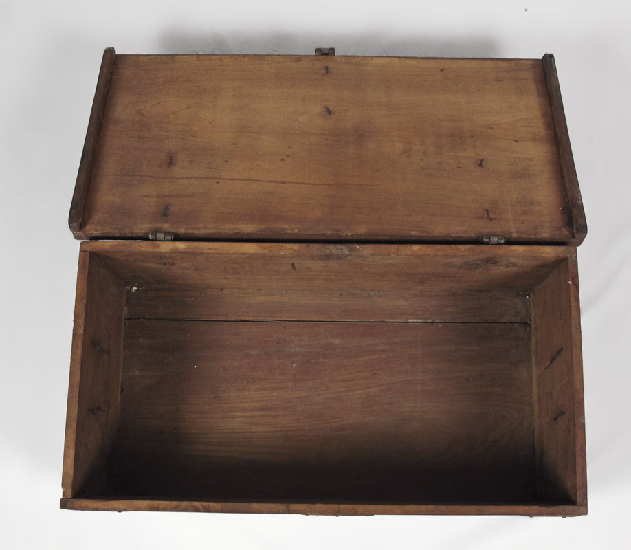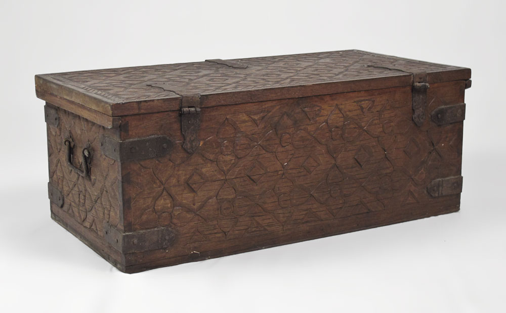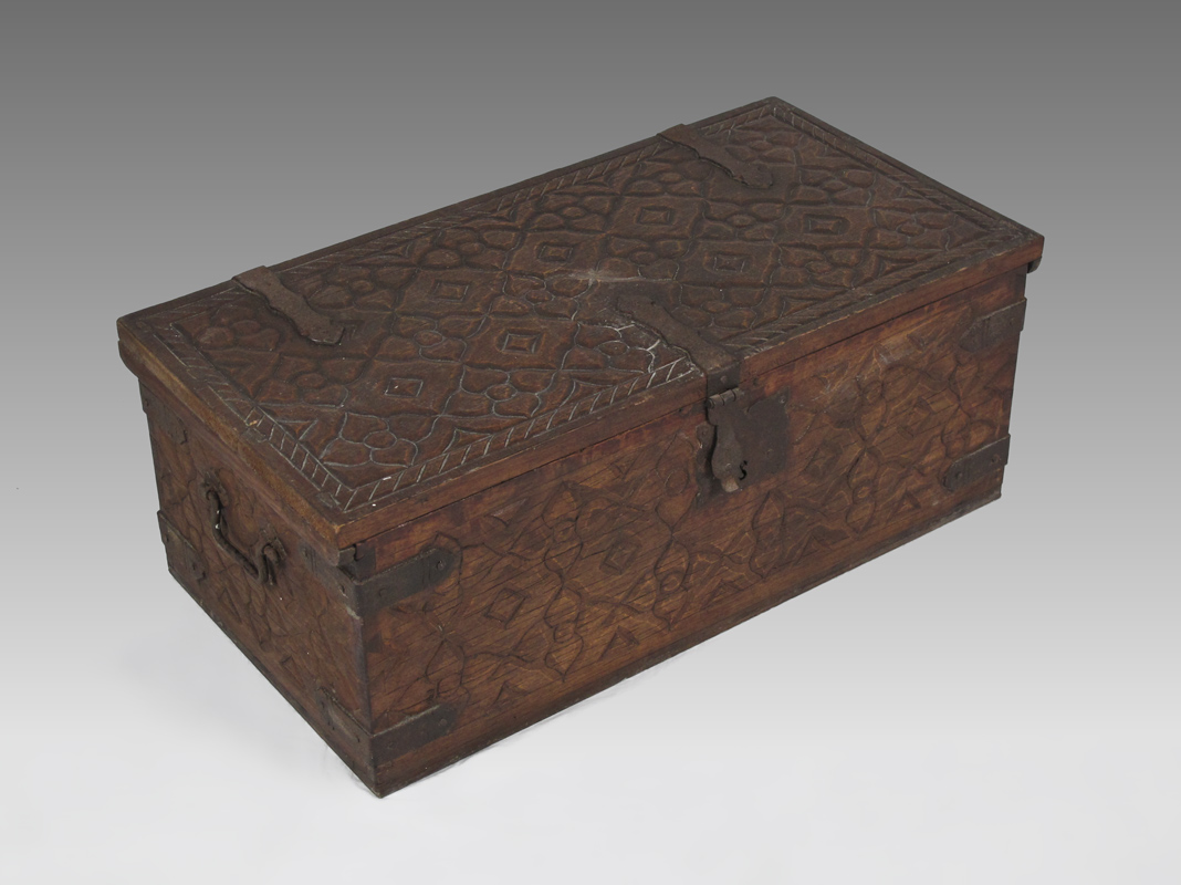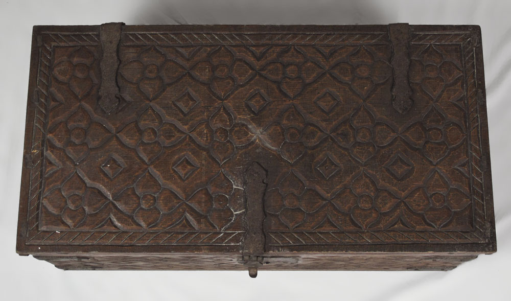 PERUVIAN SPANISH COLONIAL CARVED CHEST: Cuzco school. Hinged top with iron lock system, iron handles and hinges. All over carved geometric design. Measures approx. 13'' x 35'' x 17''.