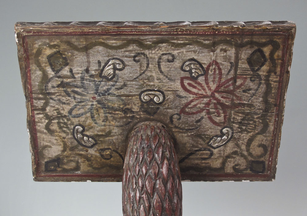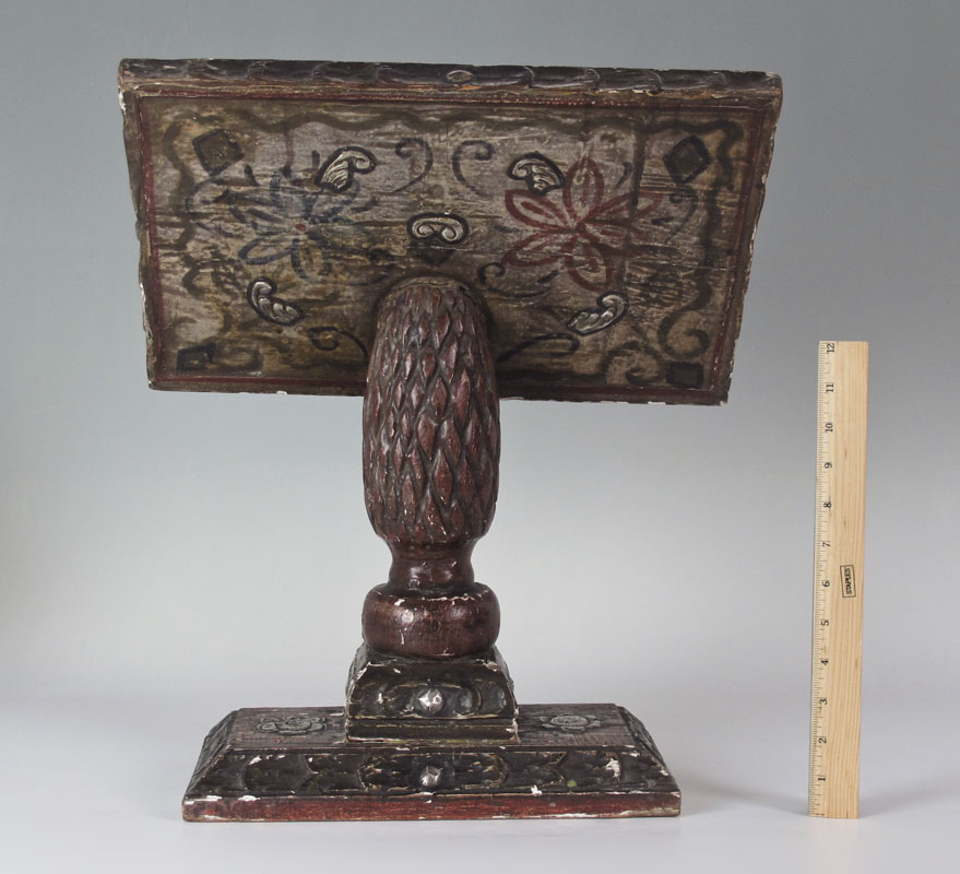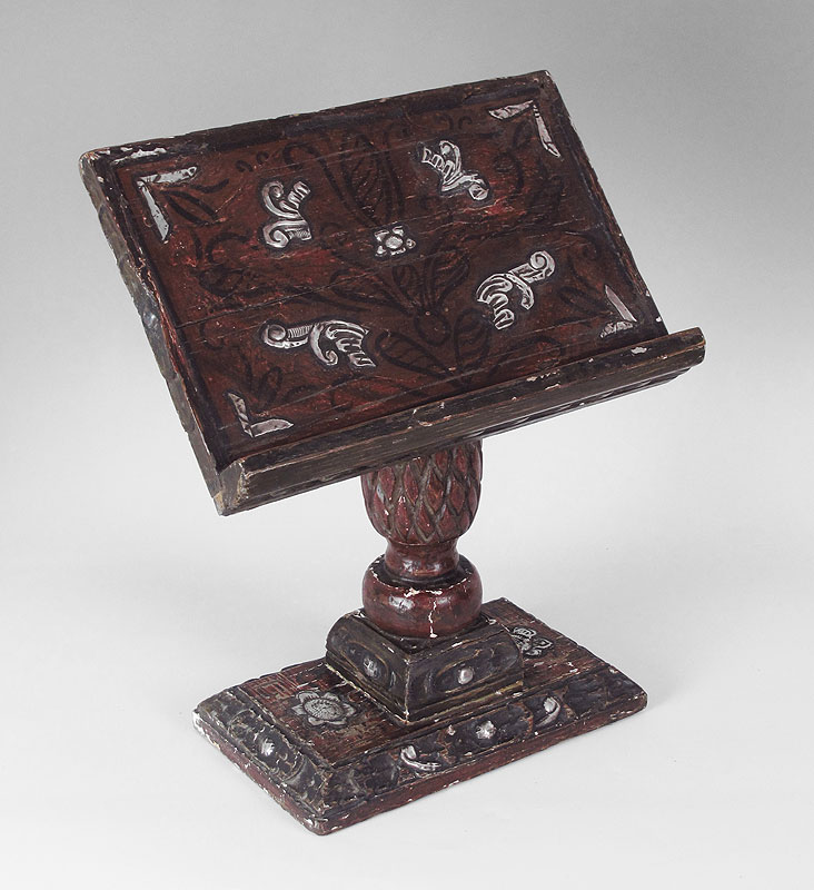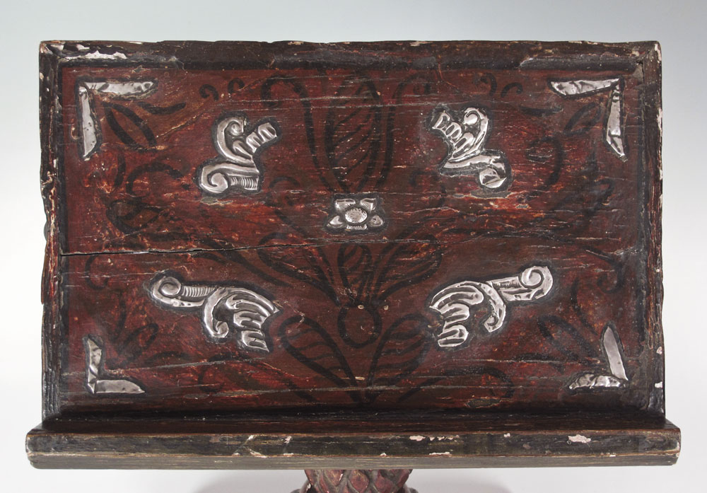 1880'S SPANISH COLONIAL PEDESTAL MISSAL STAND: Cuzco school, carved with red and black paint decoration. Silver toned embossed metal inlay. Measures 19 1/4'' h. x 16'' x 10''.