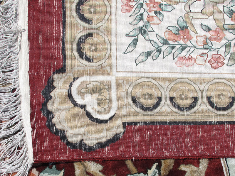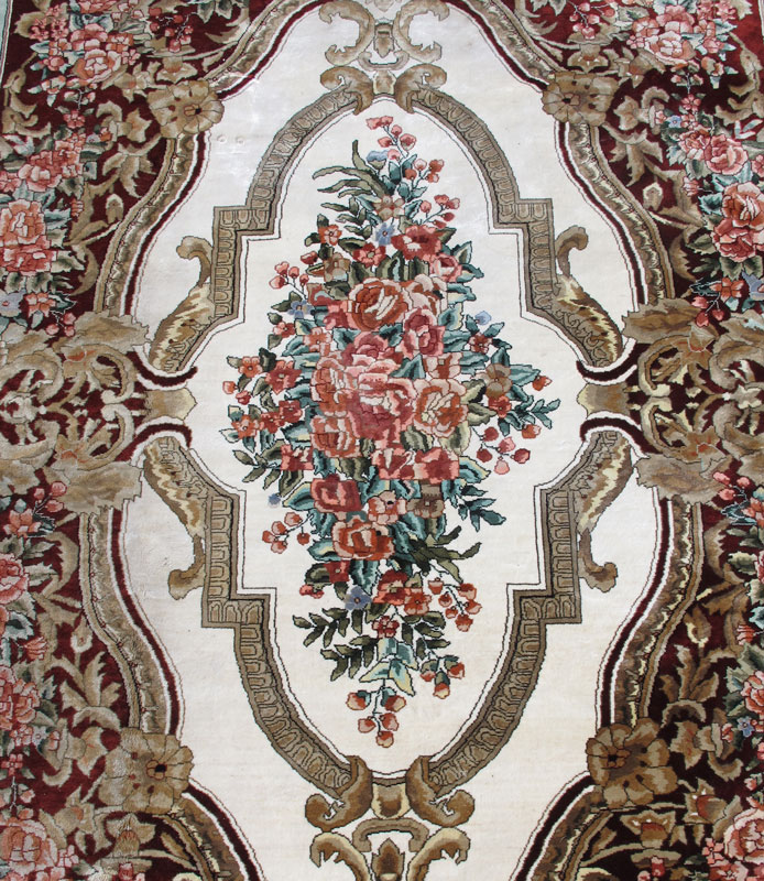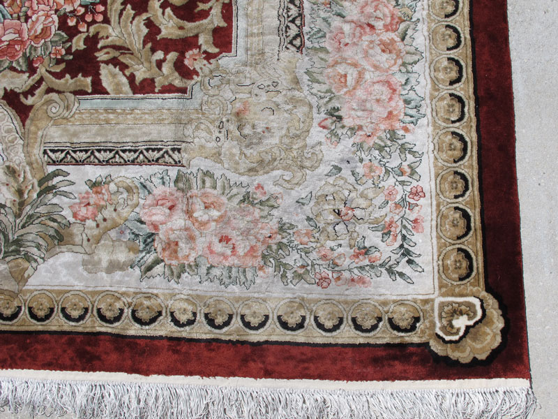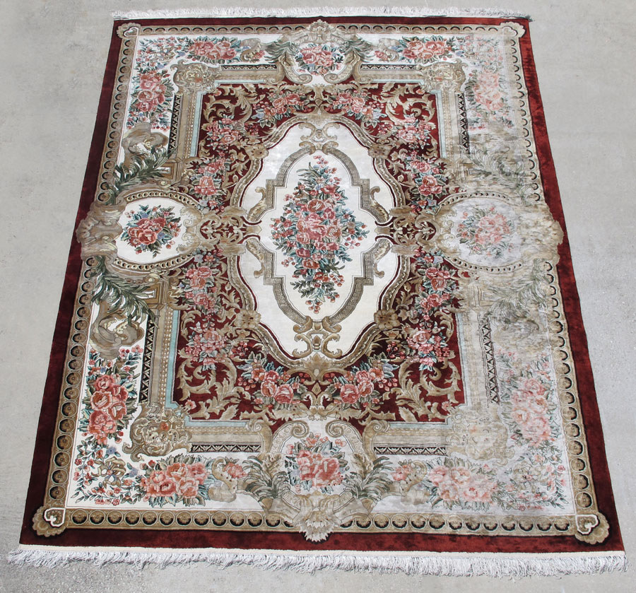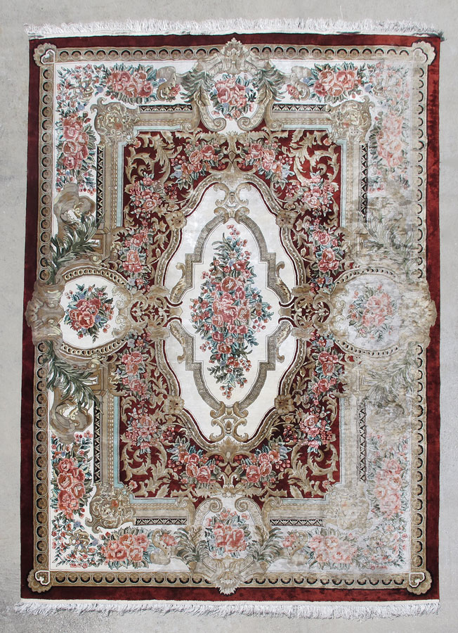 MODERN CHINESE AUBUSSON DESIGN HAND KNOTTED WOOL RUG, 9' x 12': This very pretty rug has a French Aubusson style with lush realistically drawn roses. The field is a red rust with a large oval medallion and four other medallions flowing from the borders in to the field. The medallions have ivory fields with beige borders. They have sprays of flowers in the center of each medallion.