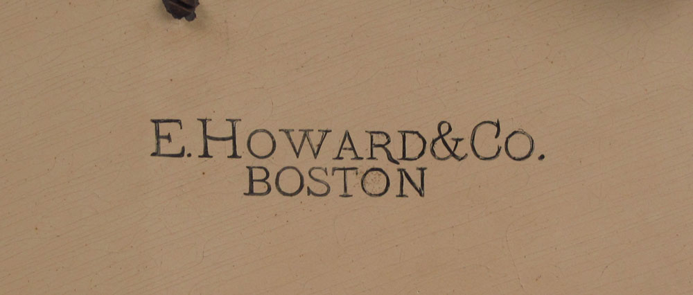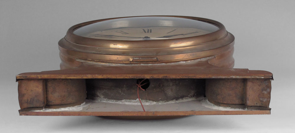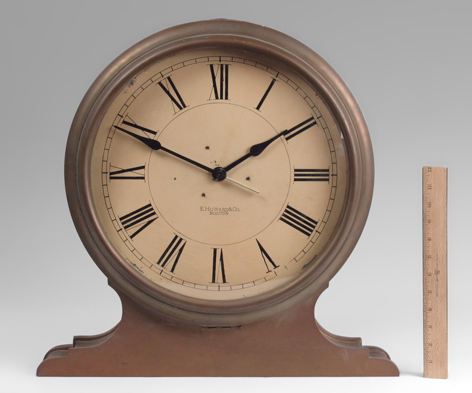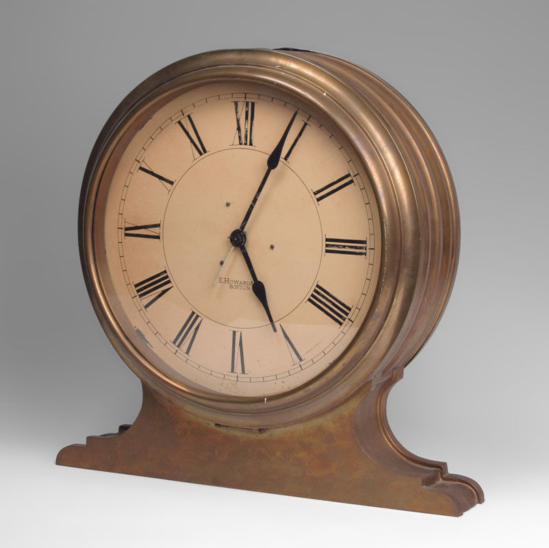 DOUBLE SIDED E. HOWARD & CO. STATION CLOCK: Brass frame double sided railroad station clock, painted metal 13 3/4'' dials on both sides, electric movement. Marked E. Howard & Co. Boston on dials. Measures 20'' h. x 20 1/2'' x 8 1/4''.