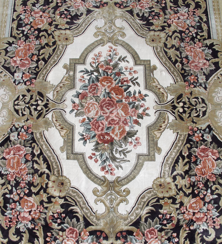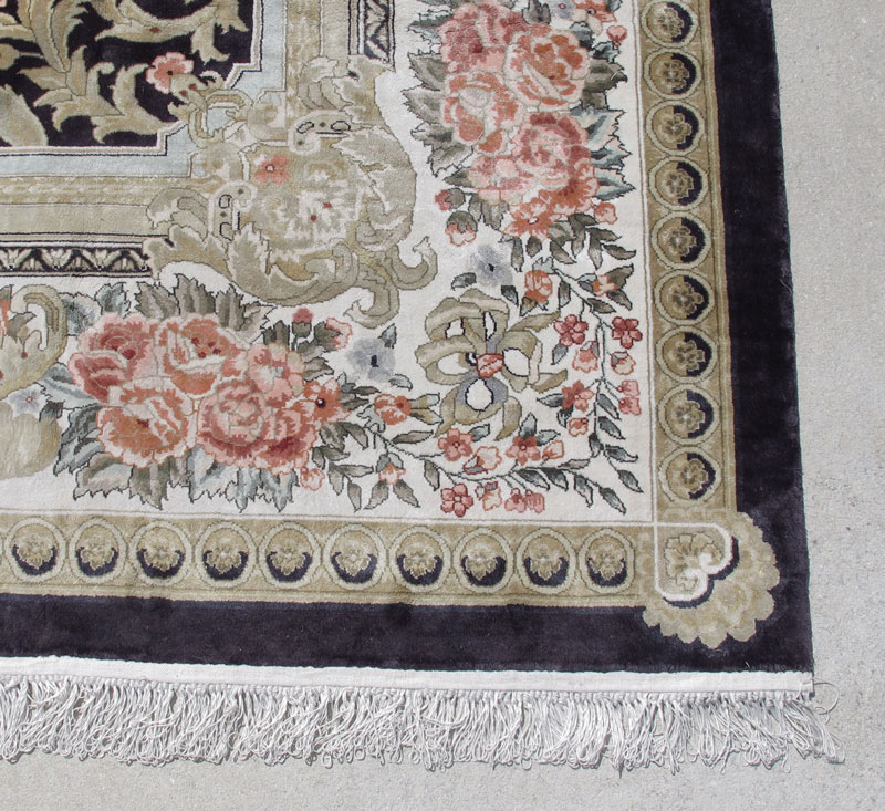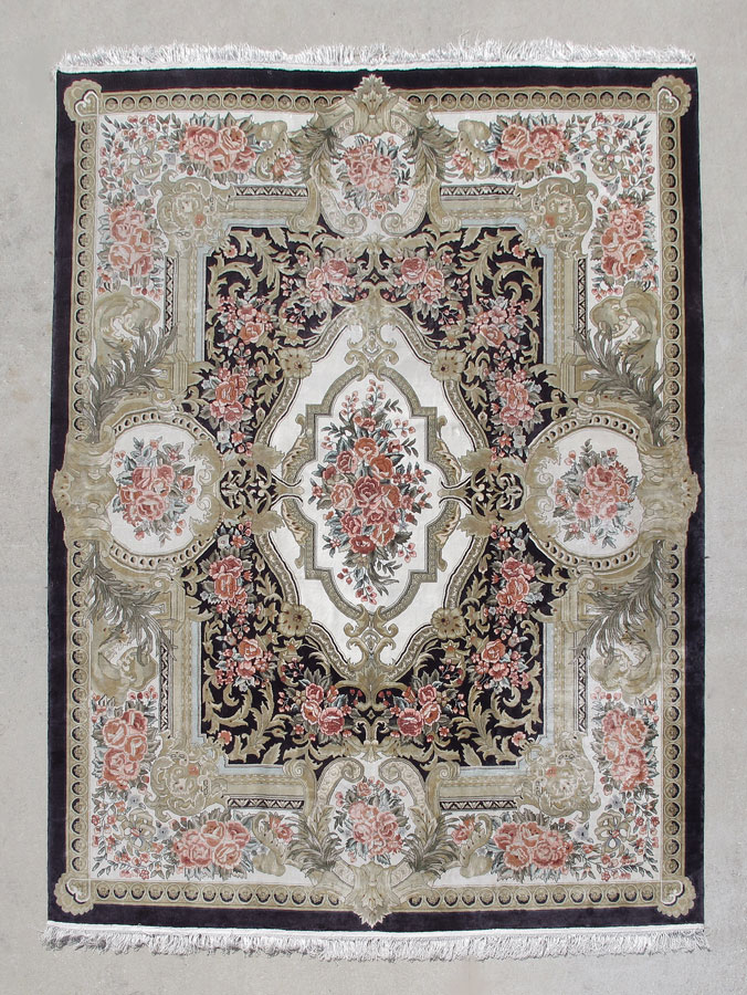 MODERN CHINESE AUBUSSON DESIGN HAND KNOTTED WOOL RUG, 8' x 10': A beautiful French Aubusson design rug that features over sized medallions, one in the center and four more medallions that flow from the borders in to the field. The medallions have ivory fields edged by beige and grey frames for the flower sprays in their centers. They are on a dramatic contrasting deep blue field that also has bouquets of realistically drawn roses around the medallions. This rug would be at home in a Salon in Paris or an upscale more formal room in your home. Condition is very good.