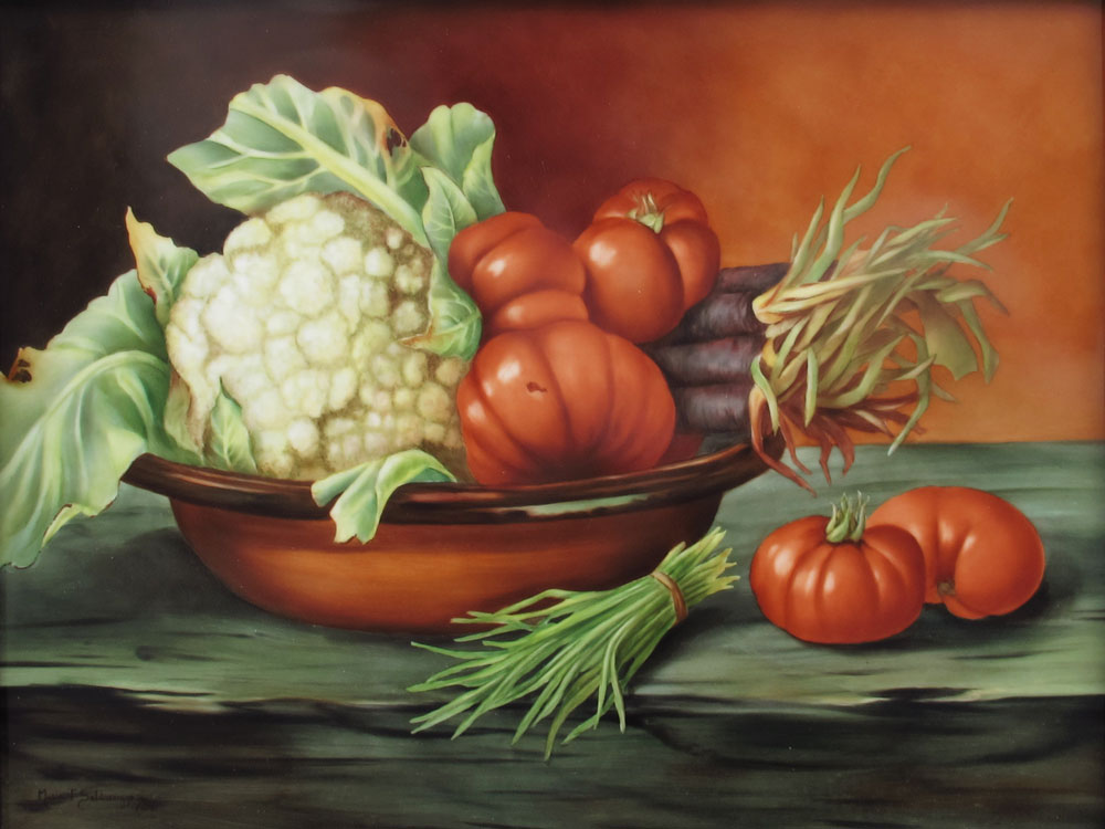 SALDARRIAGA, Maria, (American 20th C): Vegetable still life featuring cauliflower and tomatoes, Painting on Porcelain, sight size 9 1/2'' x 13 1/2'', signed lower left, dated '09, framed, 13 1/2'' x 18''.