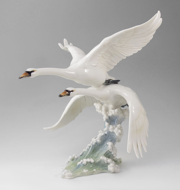 HUTSCHENREUTHER PORCELAIN MODEL OF TWO SNOW GEESE IN FLIGHT: A graceful study of geese in flight over the waters waves. Sculptor was Achtziger. 13 1/2'' x 11'' x 13''.